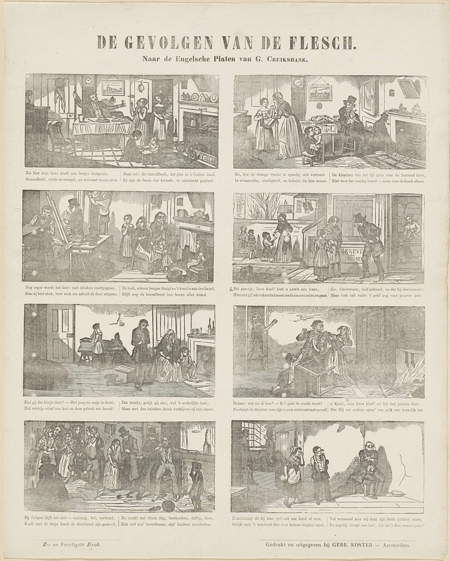 Blad met 8 voorstellingen met de gevolgen van dronkenschap. Onder elke afbeelding een vierregelig vers. Zesenveertigste druk.