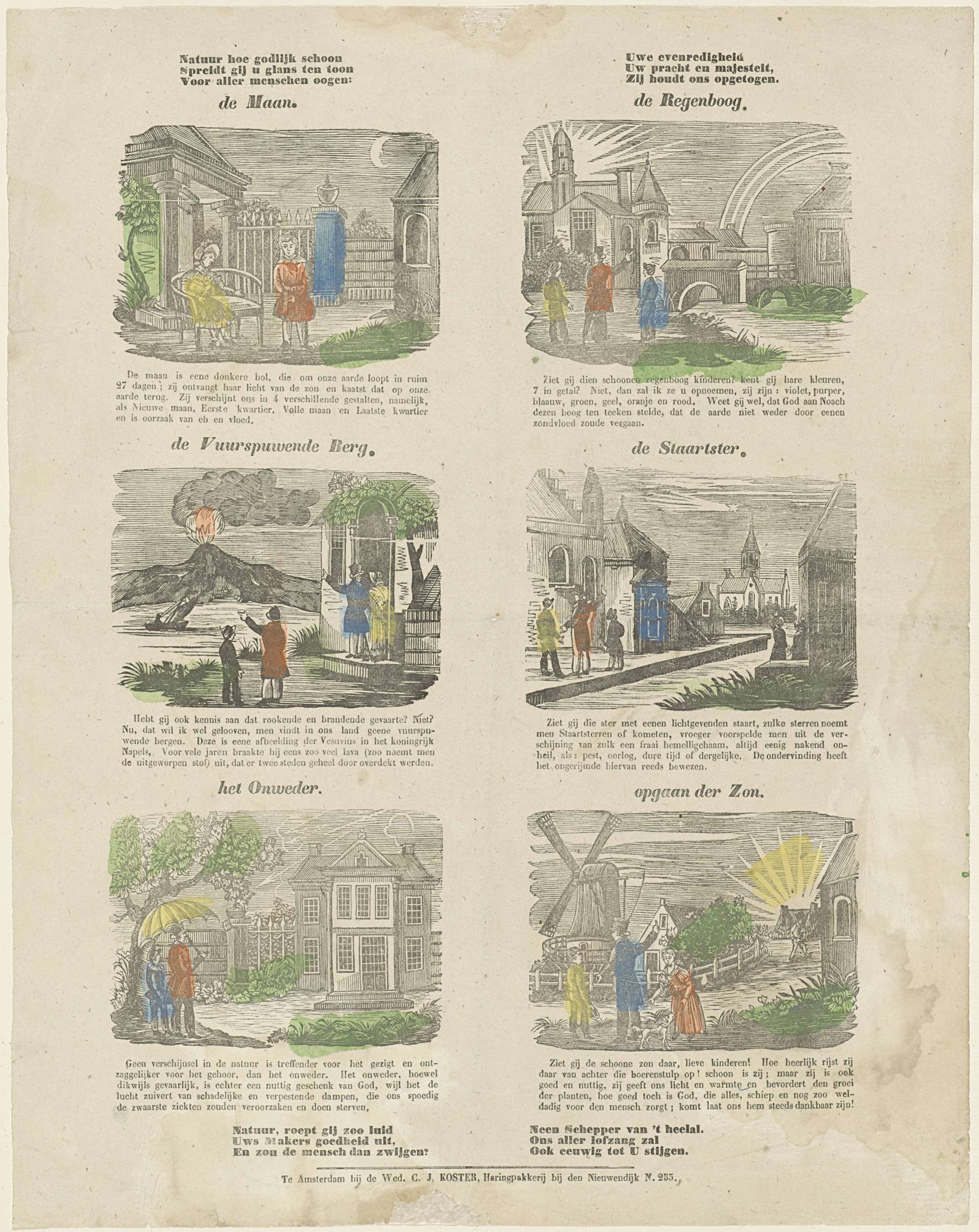 Blad met 6 voorstellingen van natuurverschijnselen, waaronder de maan, een vulkaan en onweer. Onder elke afbeelding een onderschrift en boven elke afbeelding een titel.