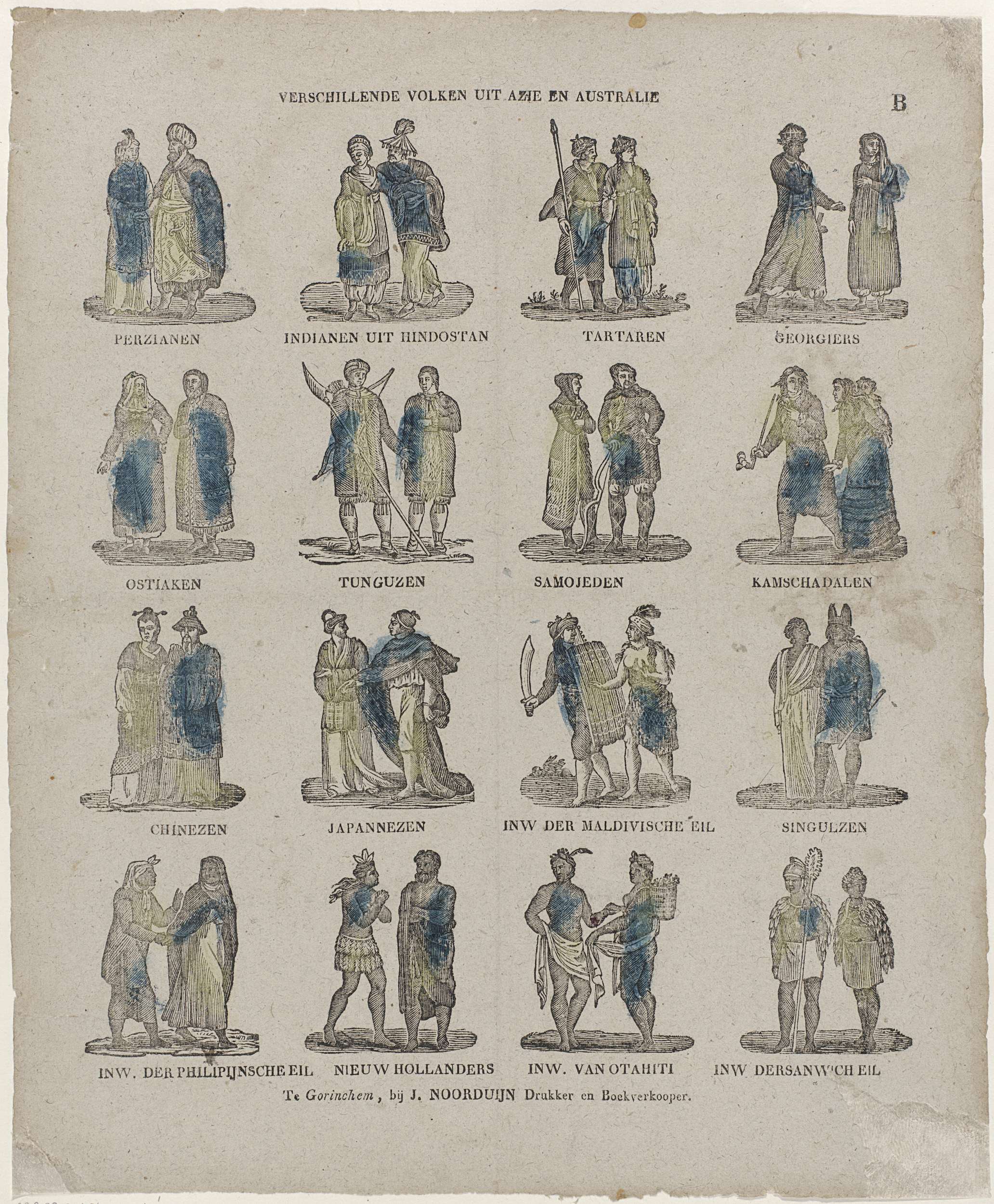 Blad met 16 voorstellingen van telkens een man en een vrouw uit Aziatische of Australische landen en steden, waaronder een stel Tartaren, een stel Ostiaken en een stel Chinezen. Onder elke voorstelling een onderschrift. Gemerkt rechtsboven: B.