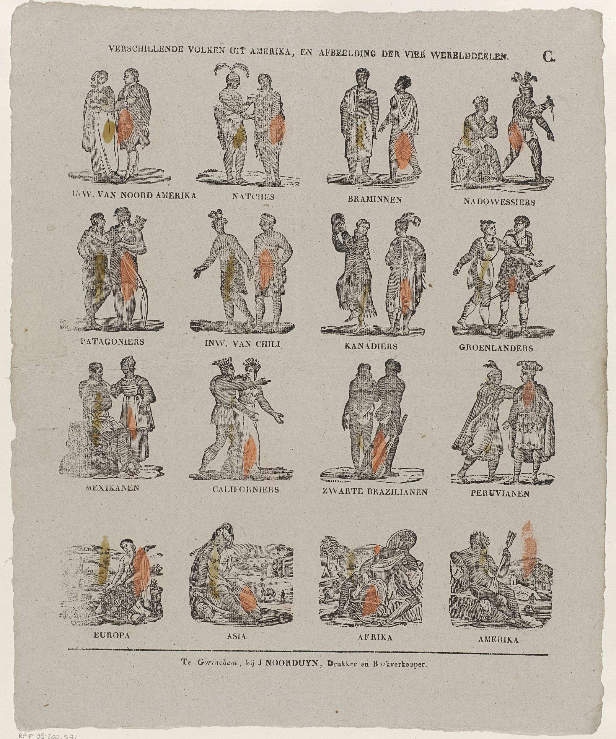 Blad met zestien voorstellingen van telkens een man en een vrouw van een Amerikaans volk, waaronder de Natches, de Groenlanders en de Mexicanen, en uitbeeldingen van de vier werelddelen. Onder elke voorstelling een onderschrift. Gemerkt rechtsboven: C.