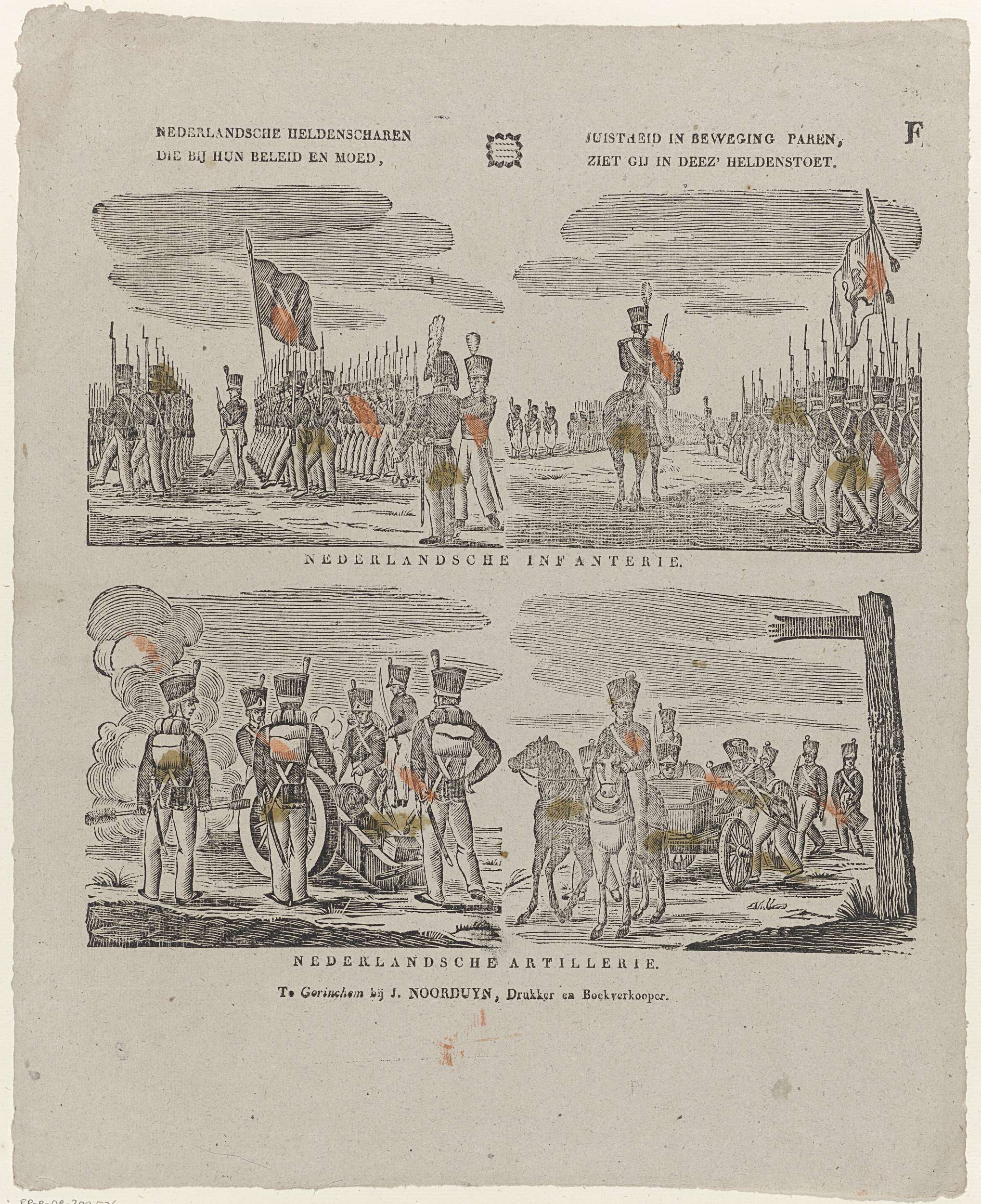Blad met 4 voorstellingen van de Nederlandse infanterie marcherend in rijen, de Nederlandse artillerie die een kanon afvuurt en soldaten die een kar vol laden. Gemerkt rechtsboven: F.