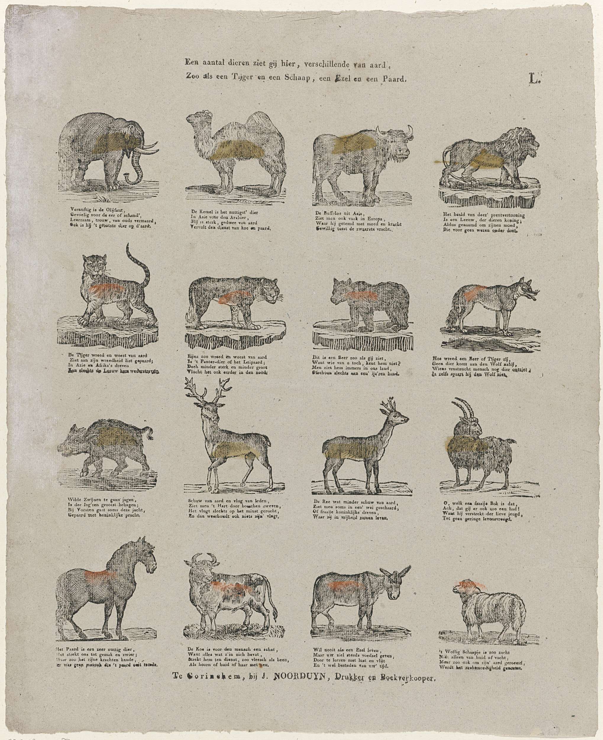Blad met 16 voorstellingen van dieren, waaronder een kameel, een olifant, een leeuw, een bok, een koe en een schaap. Onder elke afbeelding een vierregelig vers. Gemerkt rechtsboven: L.