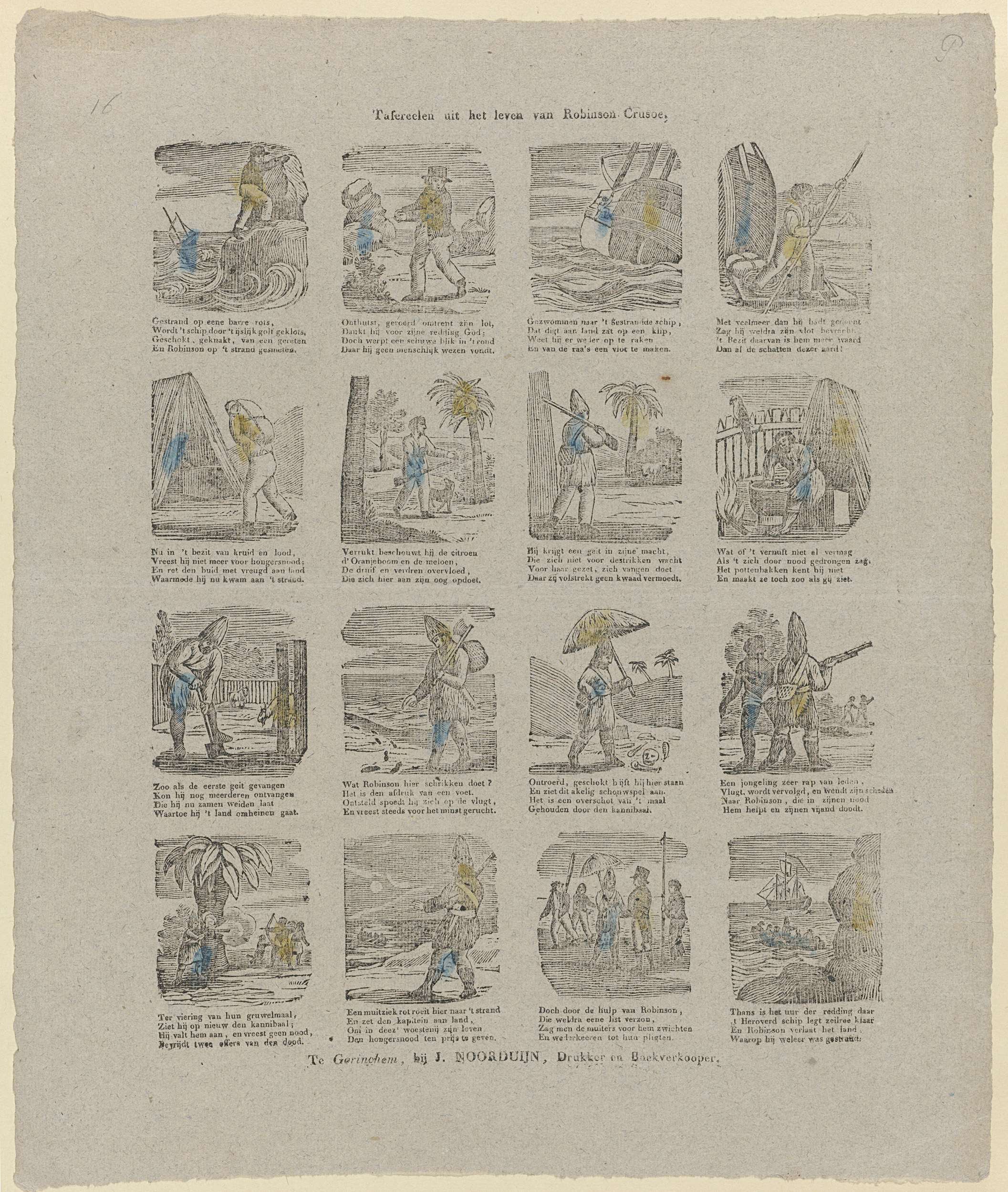 Blad met 16 voorstellingen uit het verhaal van Robinson Crusoe die strandt op een eiland. Onder elke afbeelding een vierregelig vers.