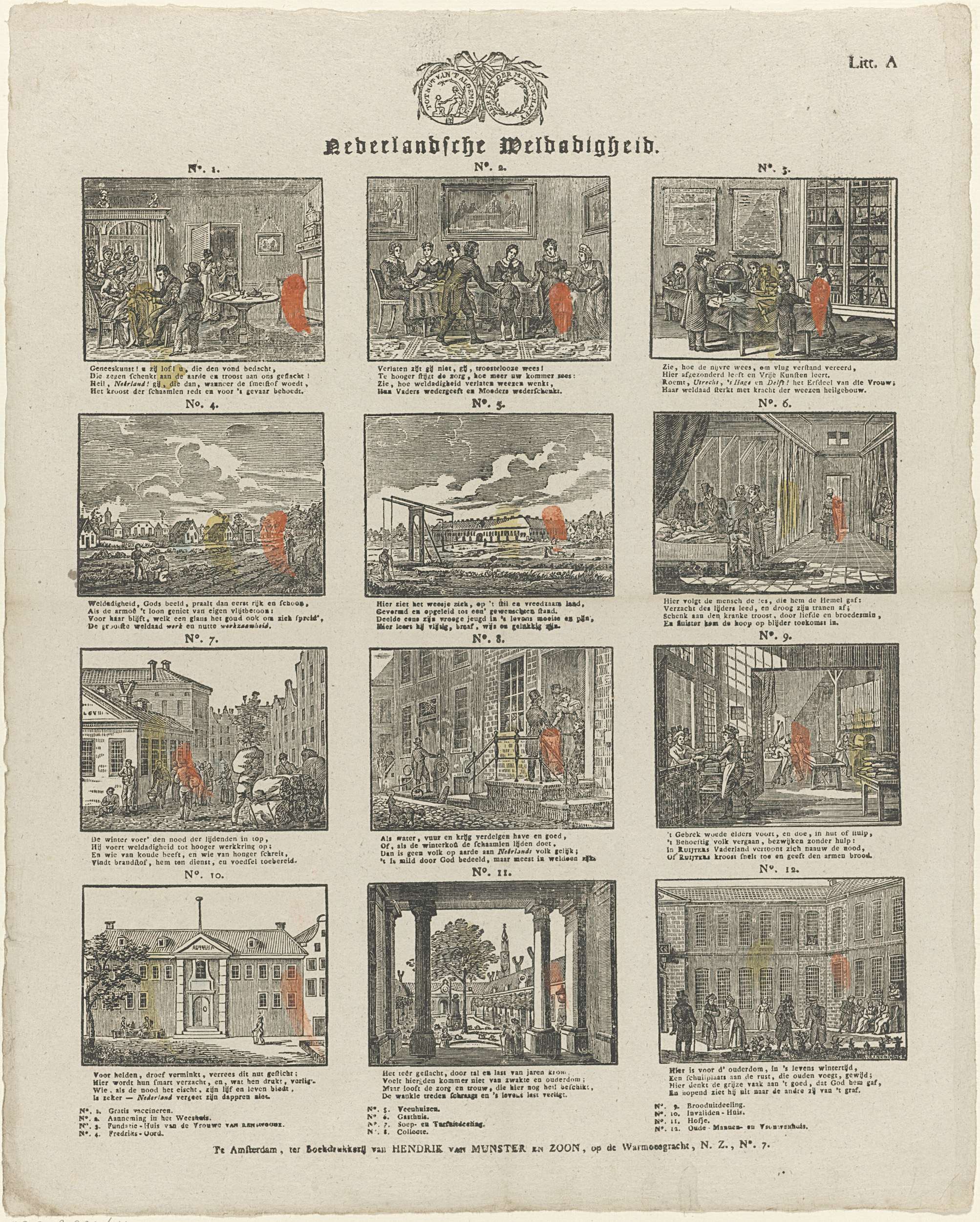 Blad met 12 voorstellingen over weldadigheid in Nederland, waaronder weergaven van gratis vaccineren, gasthuizen en brooduitdeling. Boven elke afbeelding een nummer en onder elke afbeelding een vierregelig vers. Onder aan het blad een legenda met de titels bij de prenten. Midden boven het zegel van de Maatschappij tot Nut van 't Algemeen. Gemerkt rechtsboven: Litt. ...