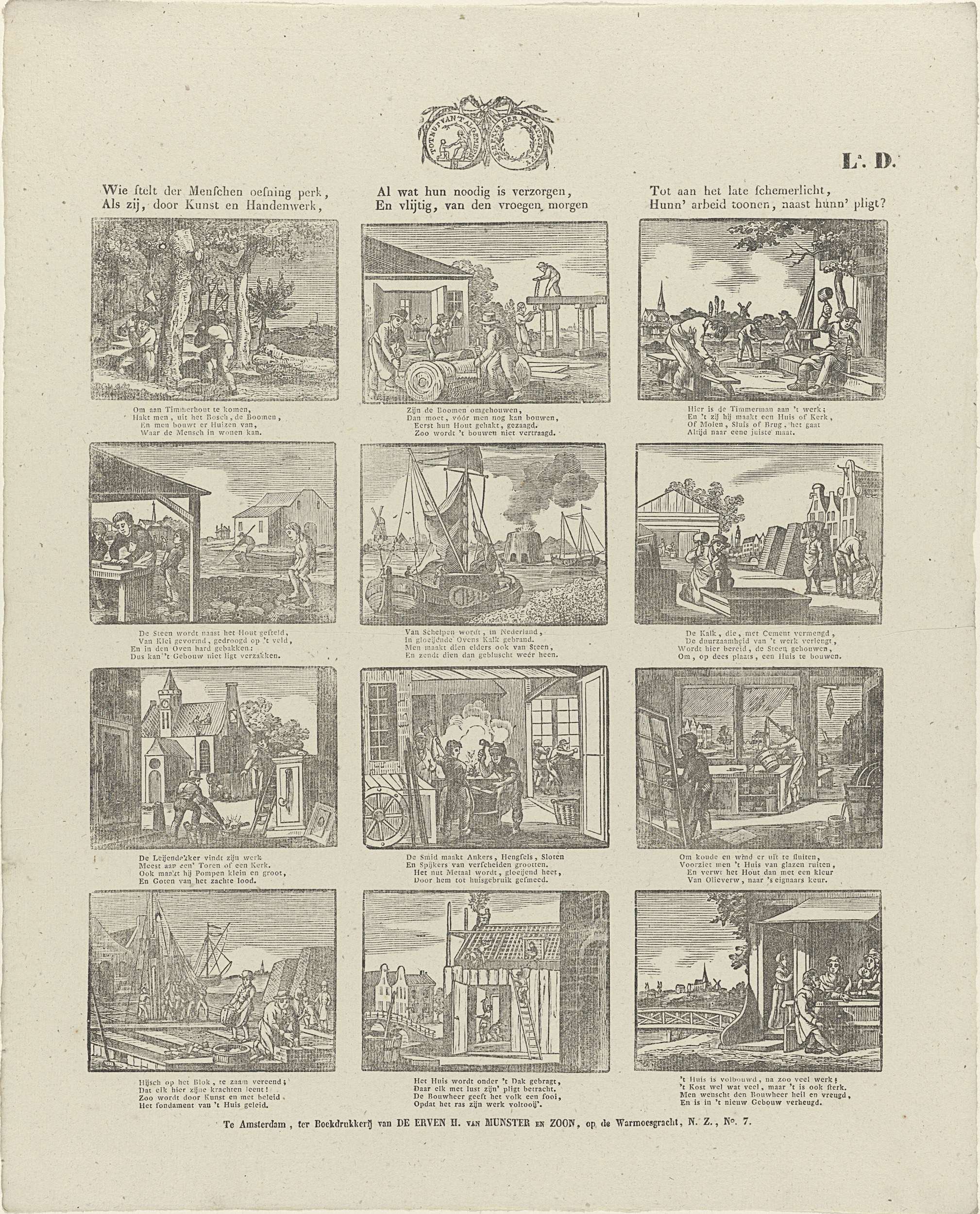 Blad met 12 voorstellingen van stappen in het bouwen van een huis, van hout verzamelen en cement maken tot een dak op het huis zetten. Onder elke afbeelding een vierregelig vers. Midden boven het zegel van de Maatschappij tot Nut van 't Algemeen. Gemerkt rechtsboven: L. D.