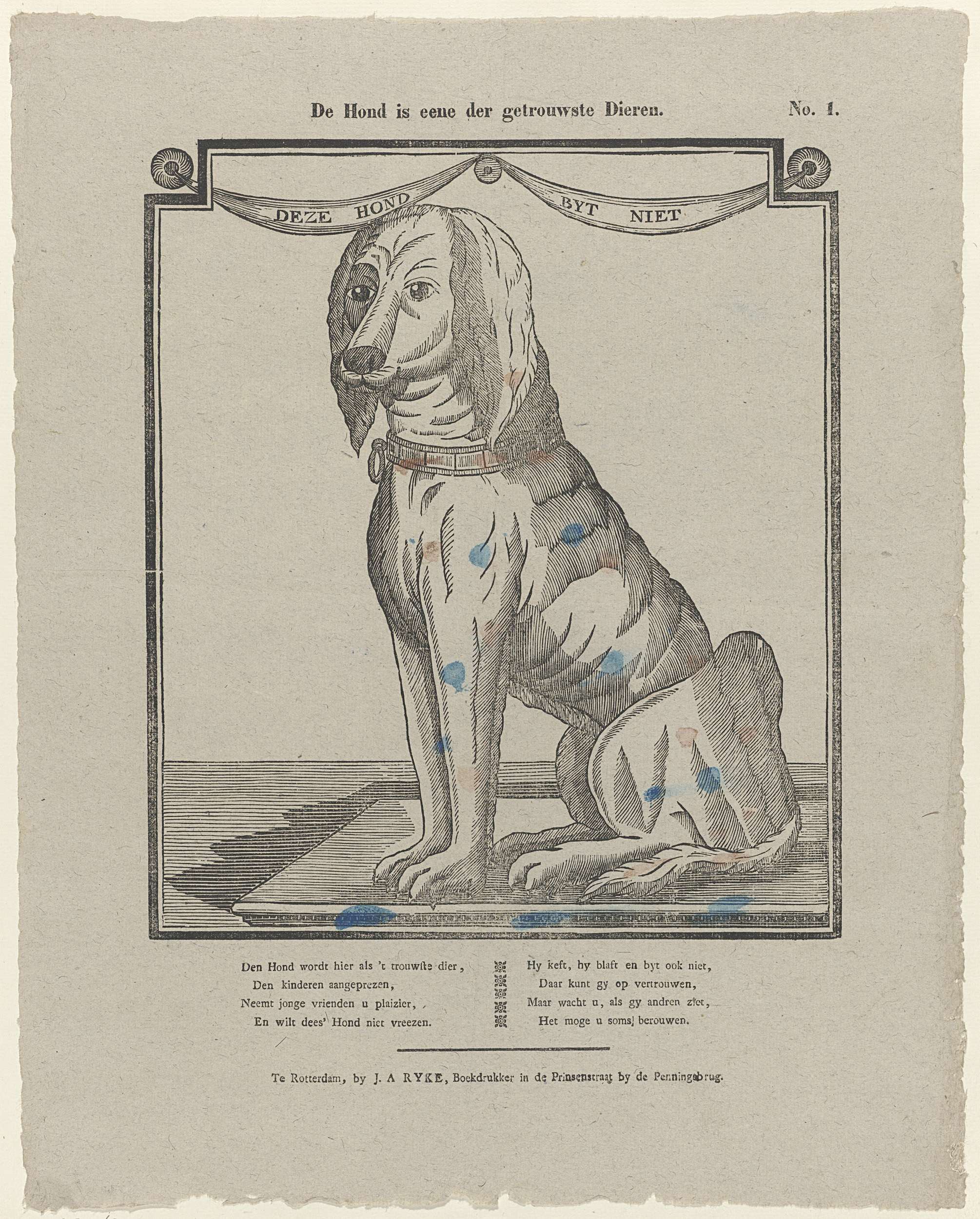 Een hond, zittend naar links, met een halsband om zijn nek. Onder de voorstelling een achtregelig vers in twee kolommen. Genummerd rechtsboven: No. 1.