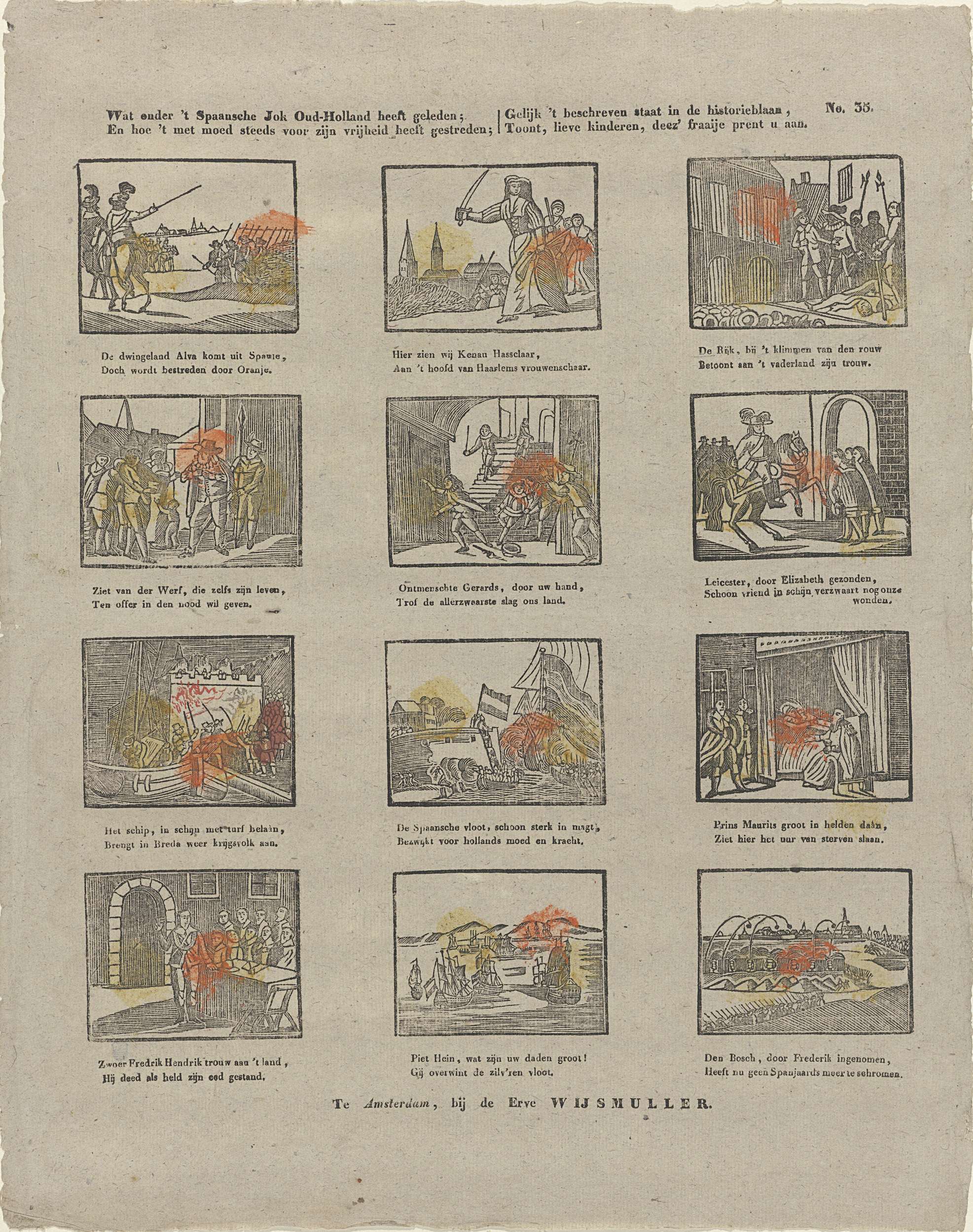 Blad met 12 voorstellingen over de Tachtigjarige oorlog, met beroemde personen, waaronder Piet Hein, Kenau Simonsdochter Hasselaer, Balthasar Gerards en prins Maurits. Onder elke afbeelding een tweeregelig vers. Genummerd rechtsboven: No. 35.