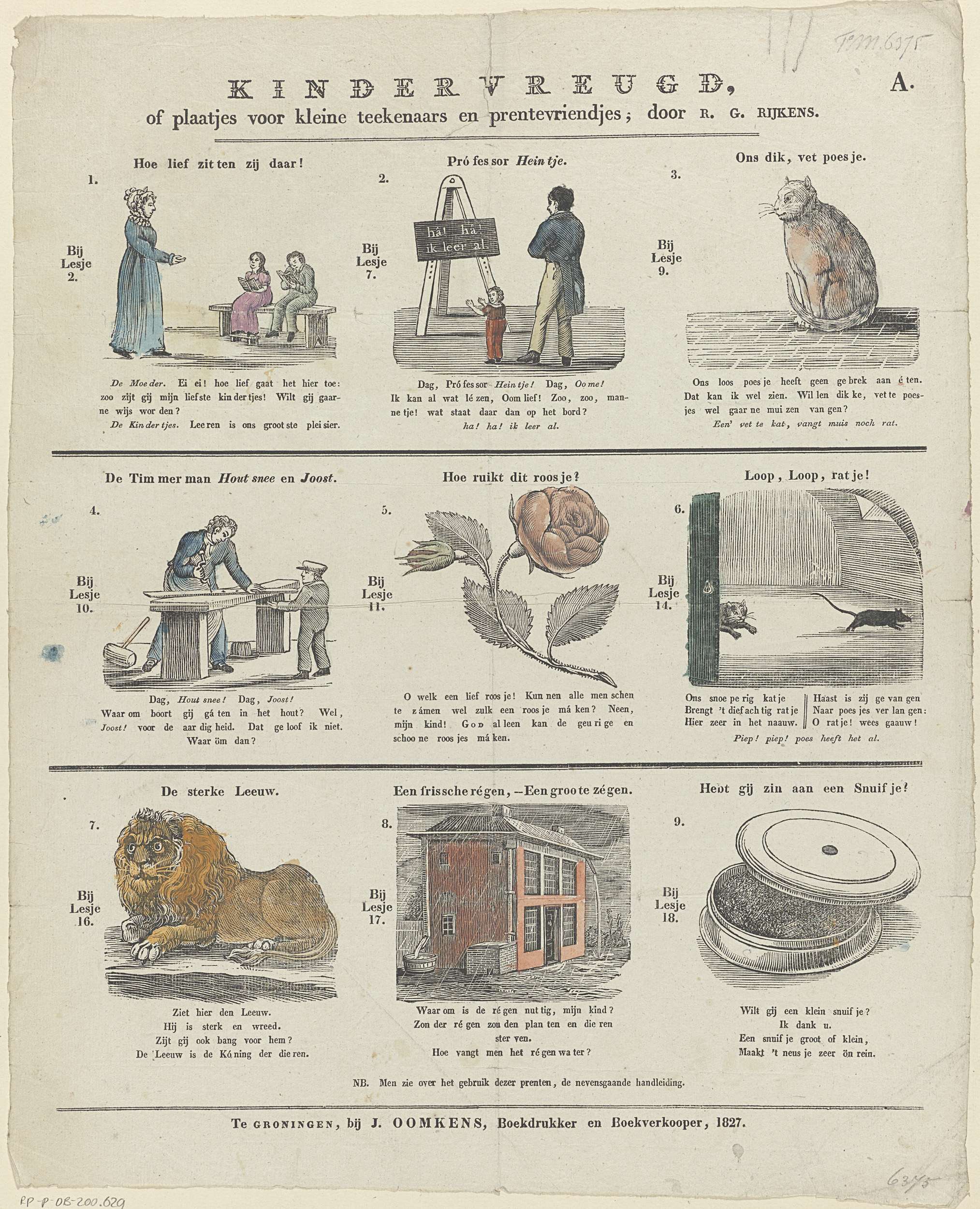 Blad met 9 illustraties (genummerd 1-9) bij leesboekjes van R.G. Rijkens. Elk plaatje hoort bij een lesje uit de boekjes "Natuurlijke Lees-Leerwijze". Weergegeven zijn ondermeer een kat, een roos, regen en een leeuw. Boven elke afbeelding een nummer en een titel en onder elke afbeelding een vierregelig vers. Links van elke afbeelding staat vermeld bij ...