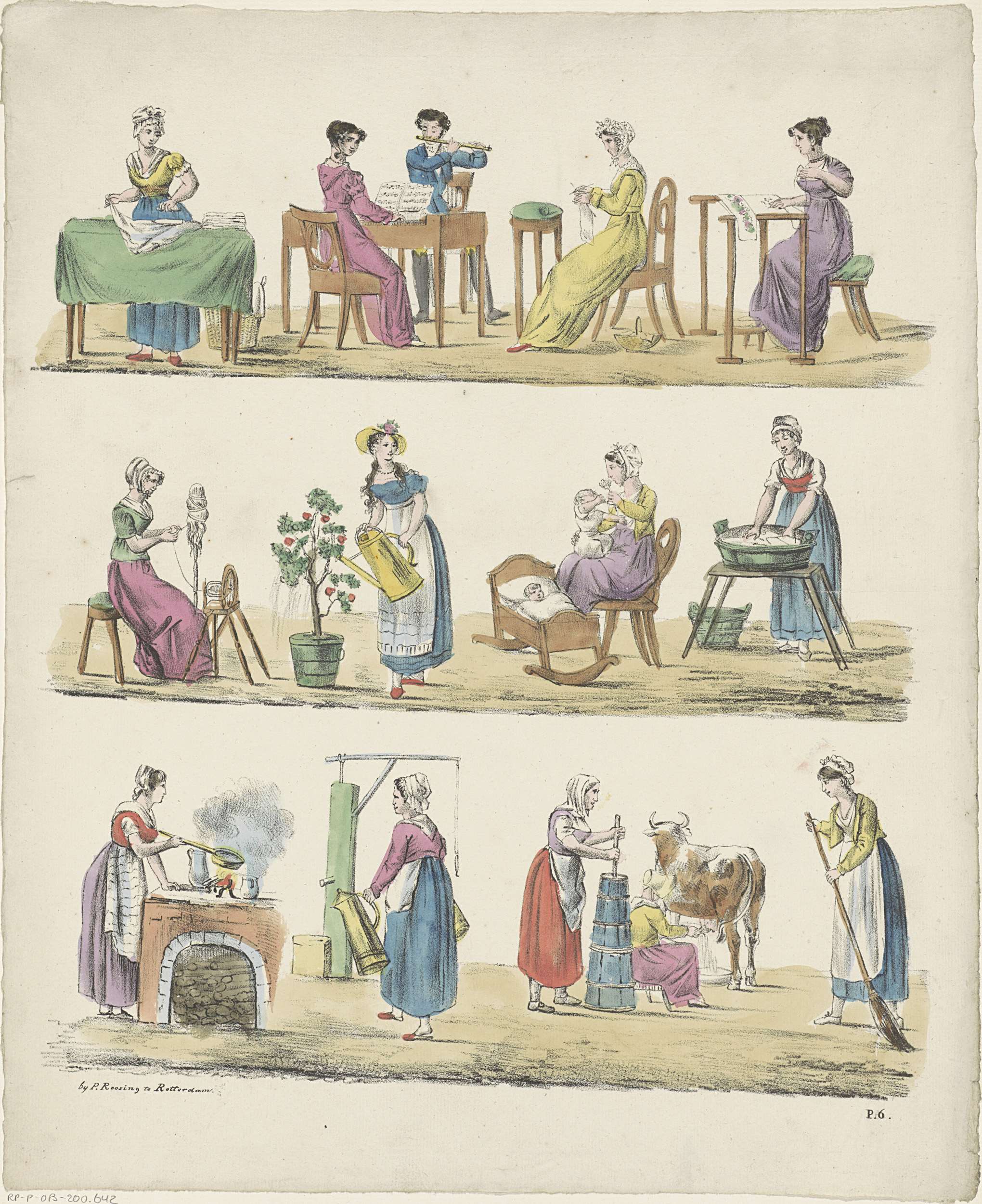 Blad met 3 horizontale rijen met voorstellingen van vrouwelijke bezigheden, zoals piano spelen, strijken, wol spinnen en de koe melken. Genummerd rechtsonder: P. 6.