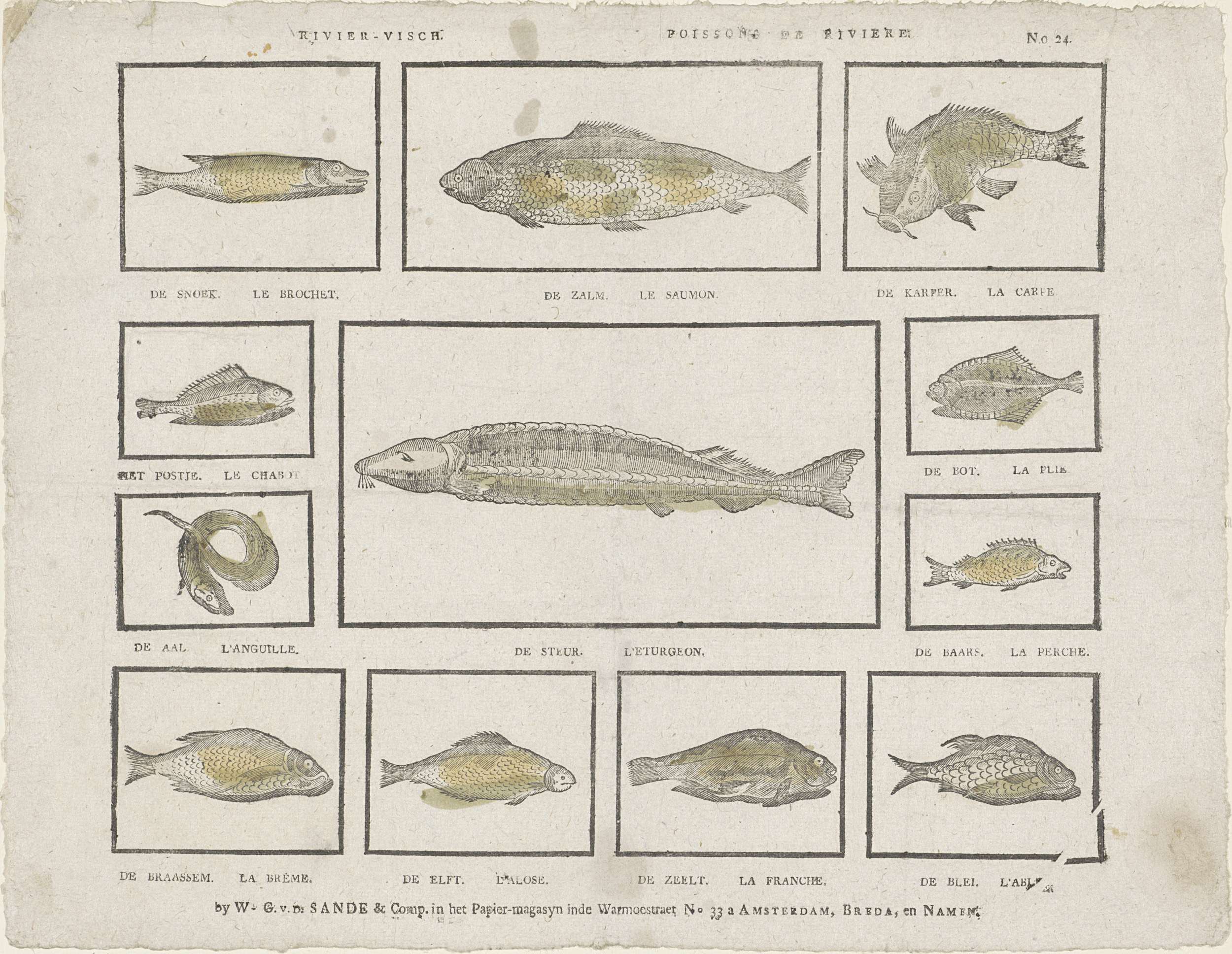 Blad 12 voorstellingen van riviervissen, zoals een zalm, een karper, een steur en een baars. Onder elke voorstelling de naam van de vis in het Nederlands en in het Frans. Genummerd rechtsboven: No. 24.