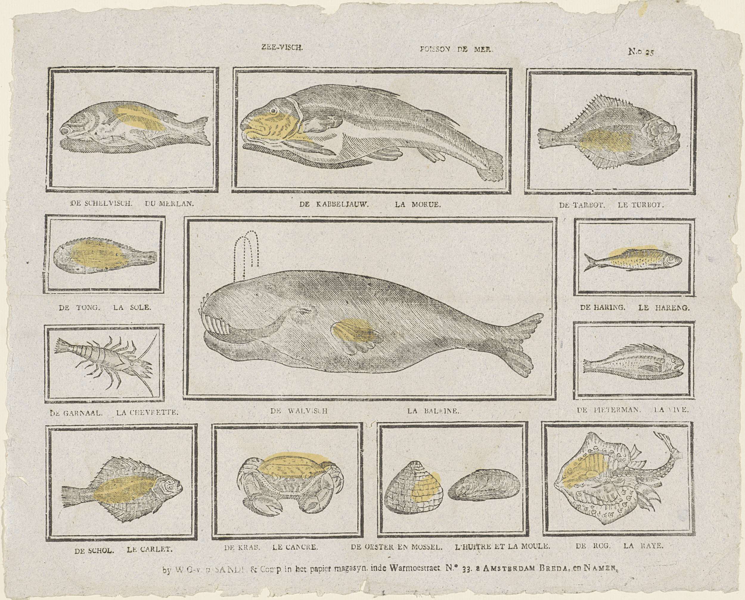 Blad 12 voorstellingen van zeevissen, een krab, een kreeft en schelpen. Onder elke voorstelling de naam van het zeedier in het Nederlands en in het Frans. Genummerd rechtsboven: No. 25.
