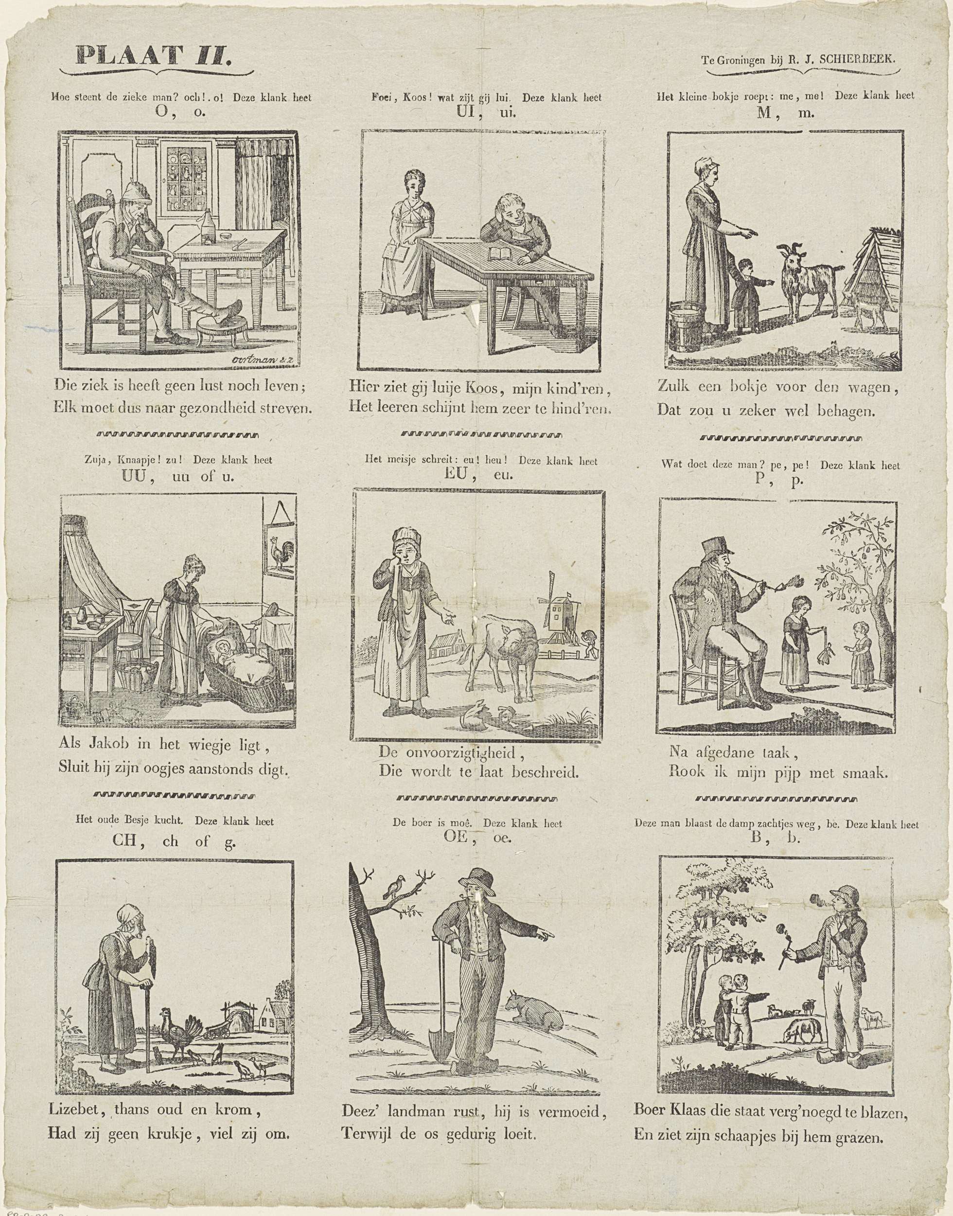 Blad met 9 uitbeeldingen van klanken. Waaronder lui voor de klank 'UI' en een kuchende oude vrouw voor de klank 'CH'. Boven elke afbeelding een bovenschrift en onder elke afbeelding een tweeregelig vers. Genummerd linksboven: PLAAT II.