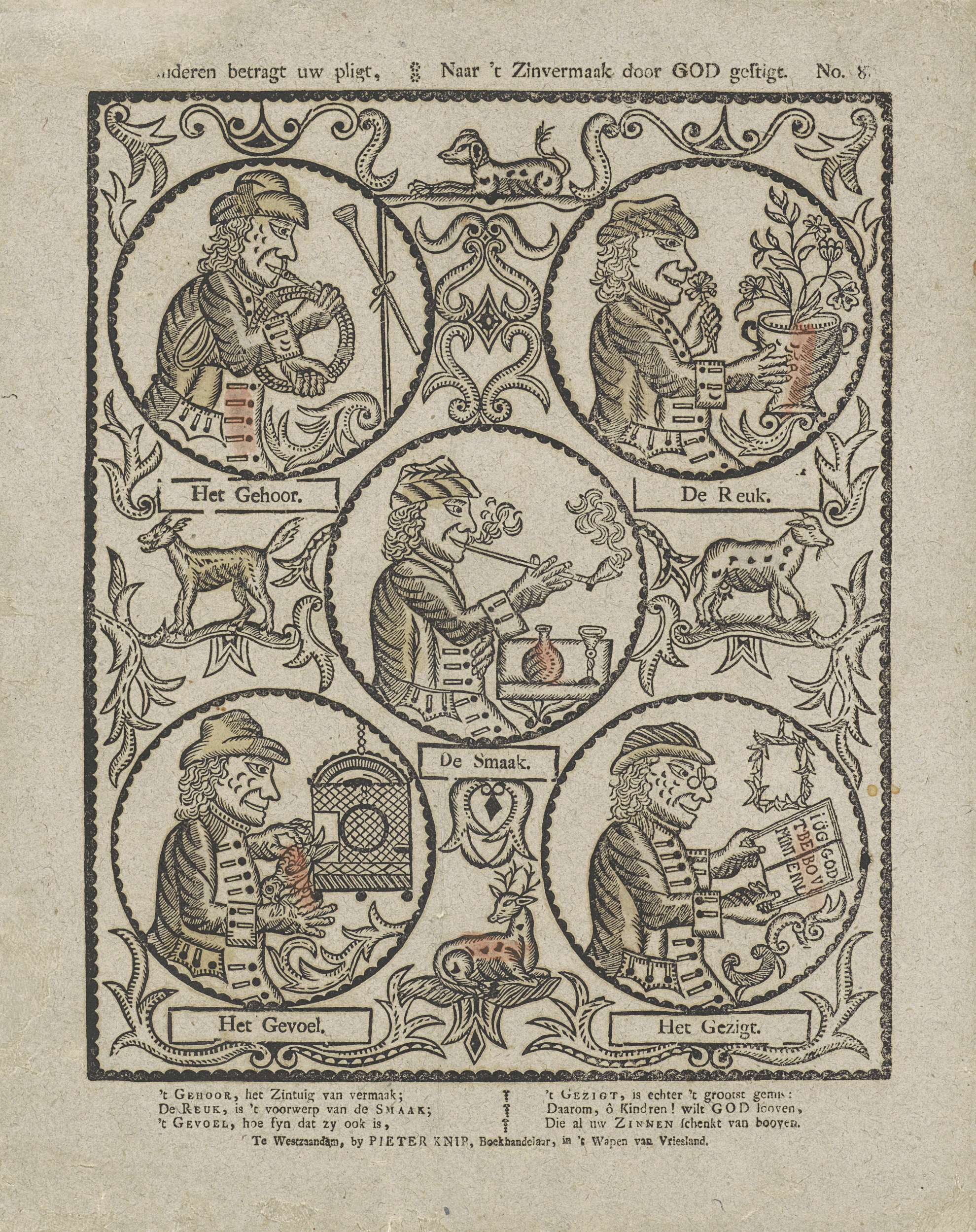 De vijf zintuigen verbeeld in vijf medaillons omgeven door ranken en dieren. Onder de voorstelling een zesregelig vers in twee kolommen. Genummerd rechtsboven: No 8.