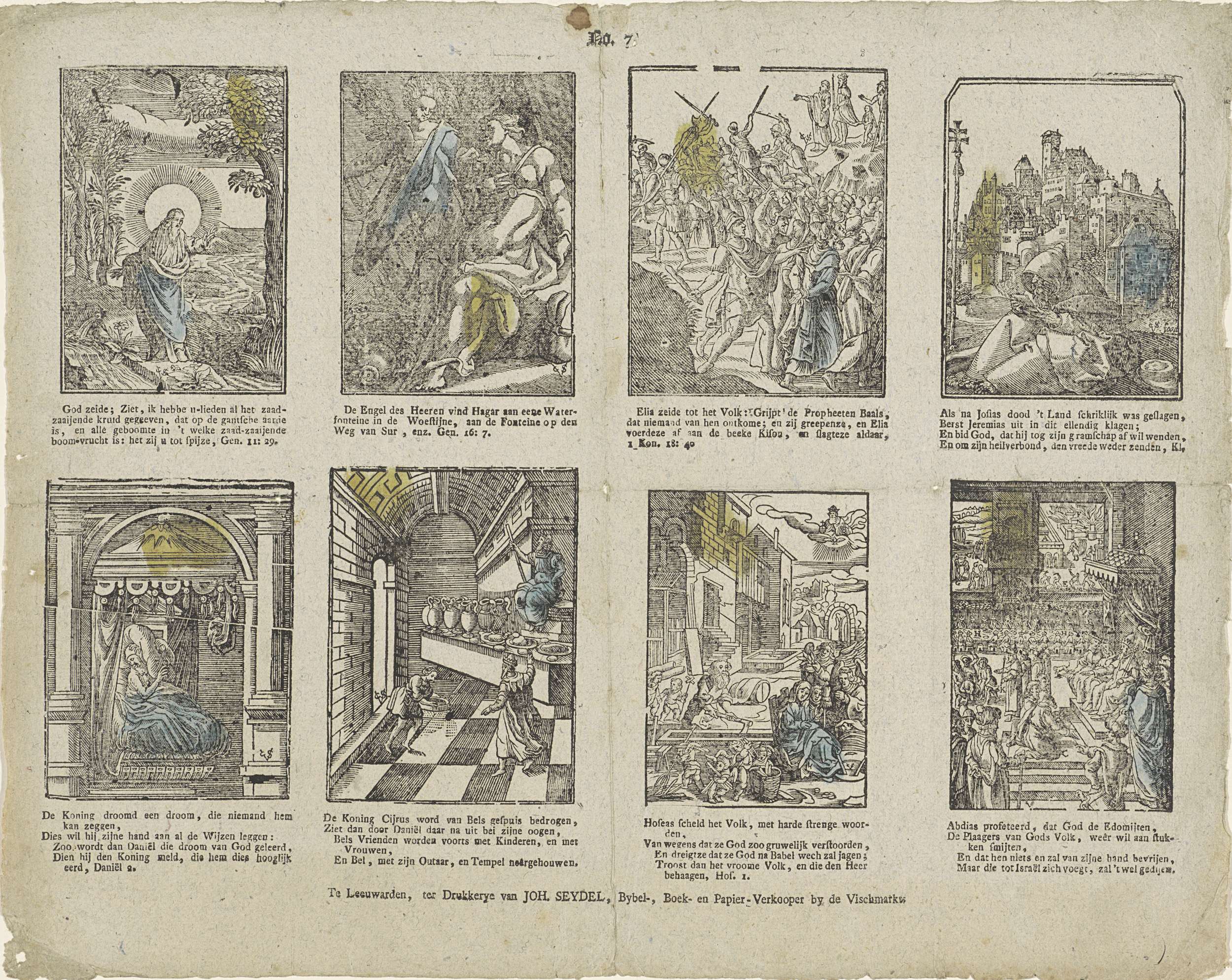 Blad met 8 voorstellingen van verhalen uit het Oude Testament. Onder elke afbeelding een onderschrift. Genummerd midden boven: No. 7.