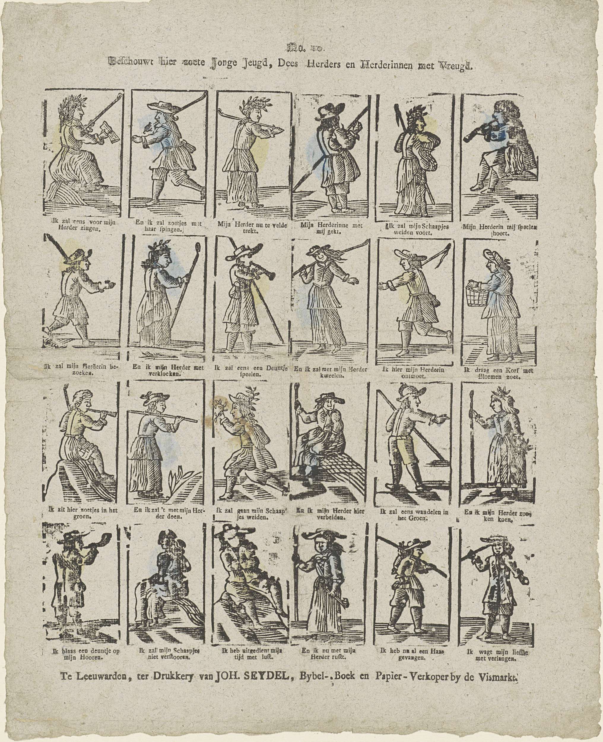Blad met 24 voorstellingen van herders en herderinnen. Onder elke afbeelding een onderschrift. Genummerd midden boven: No. 10.