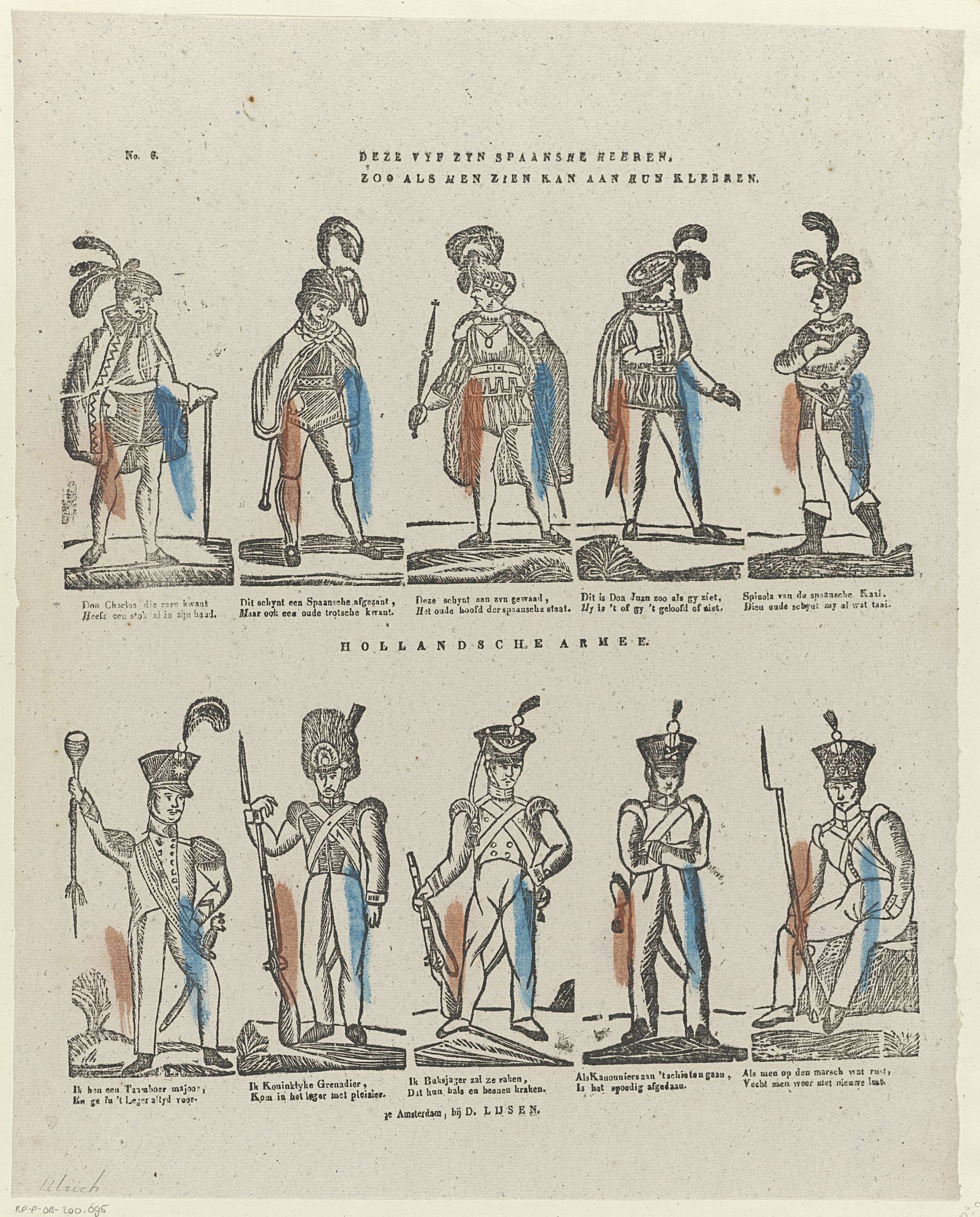 Blad met 10 voorstellingen van mannen. Boven: vijf rijk uitgedoste Spaanse heren, waaronder Don Carlos en Don Juan. Onder: vijf Nederlandse soldaten. Onder elke afbeelding een tweeregelig vers. Genummerd linksboven: No. 6.