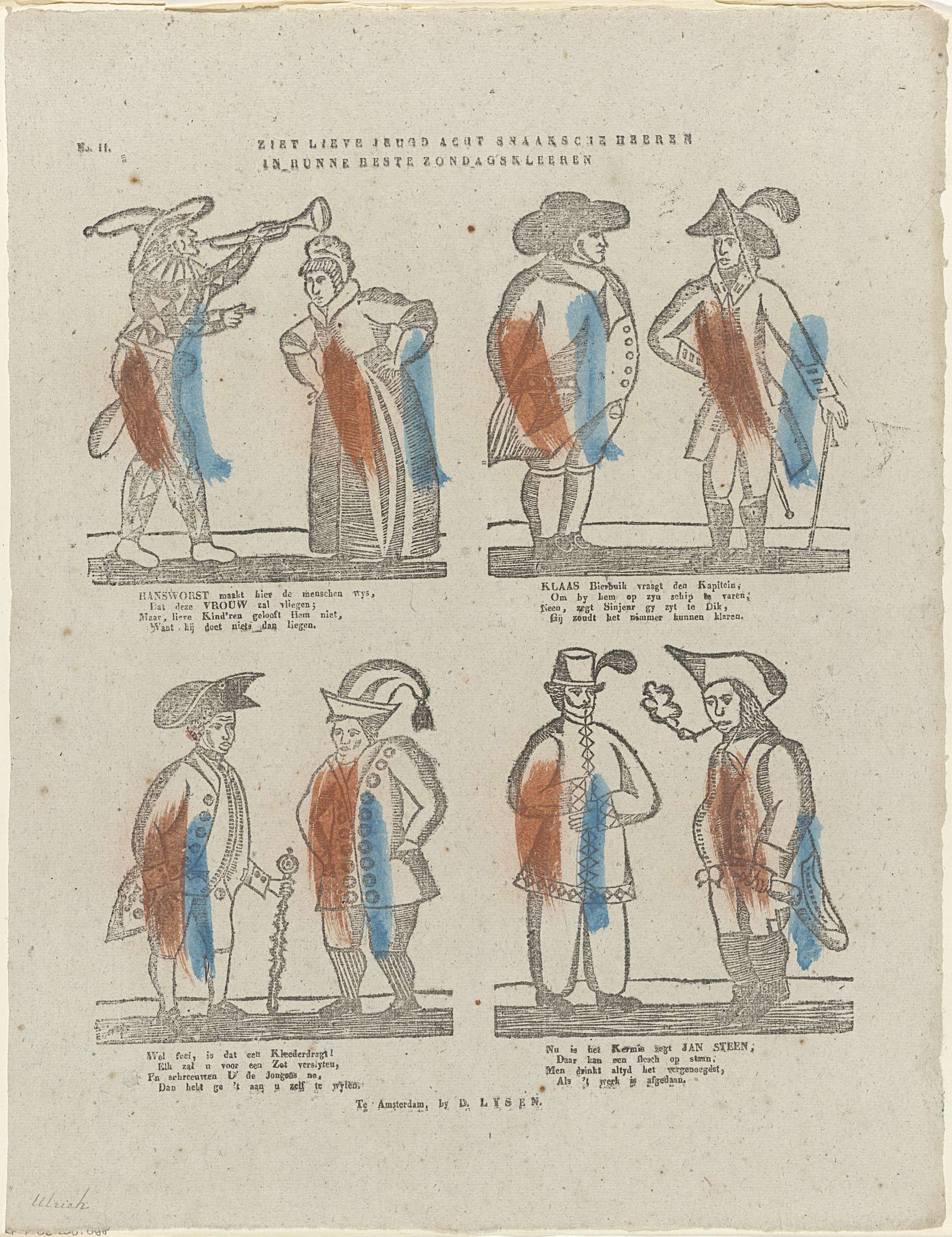 Blad met 4 voorstellingen van telkens twee figuren, waaronder Hansworst, een man met een bierbuik en Jan Steen. Onder elke afbeelding een vierregelig vers. Genummerd linksboven: no. 11.