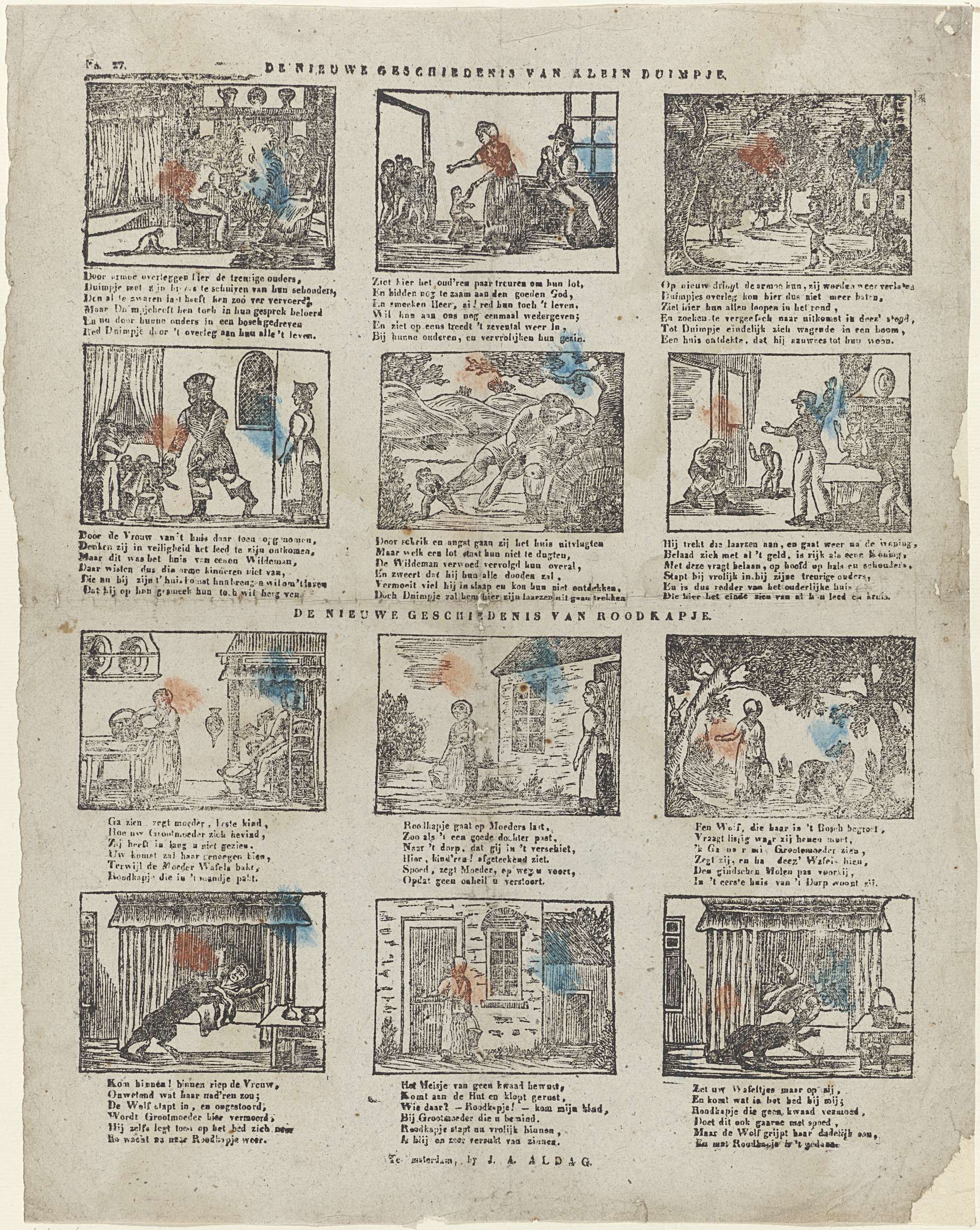 Blad met 12 voorstellingen, waarvan zes voorstellingen uit het verhaal van Klein Duimpje en zes voorstellingen uit het verhaal van Roodkapje. Onder elke voorstelling een zesregelig vers. Genummerd linksboven: No. 27.