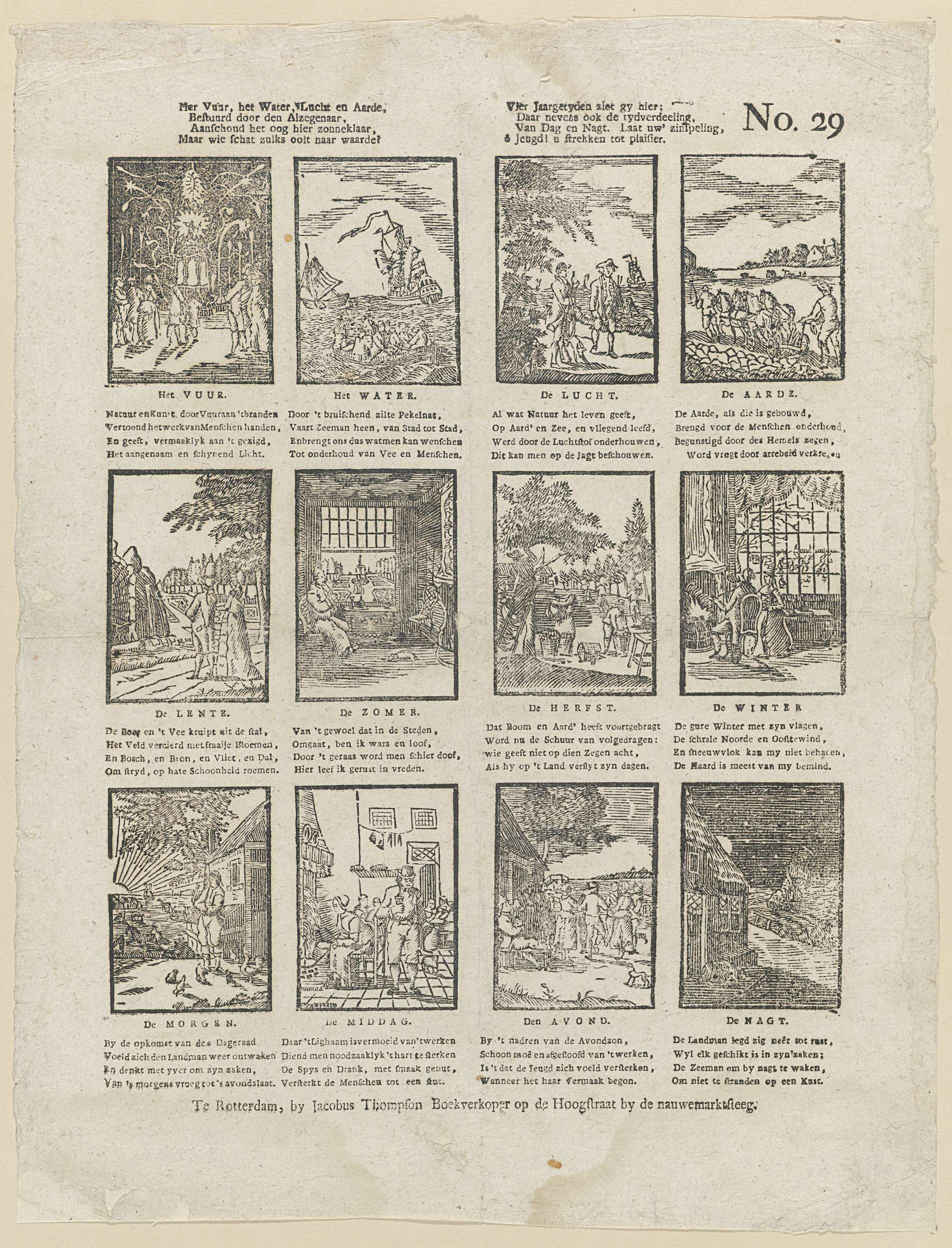 Blad met 12 voorstellingen van de vier elementen, de vier jaargetijden en de vier getijden van de dag. Onder elke afbeelding een titel en een vierregelig vers. Genummerd rechtsboven: No. 29.