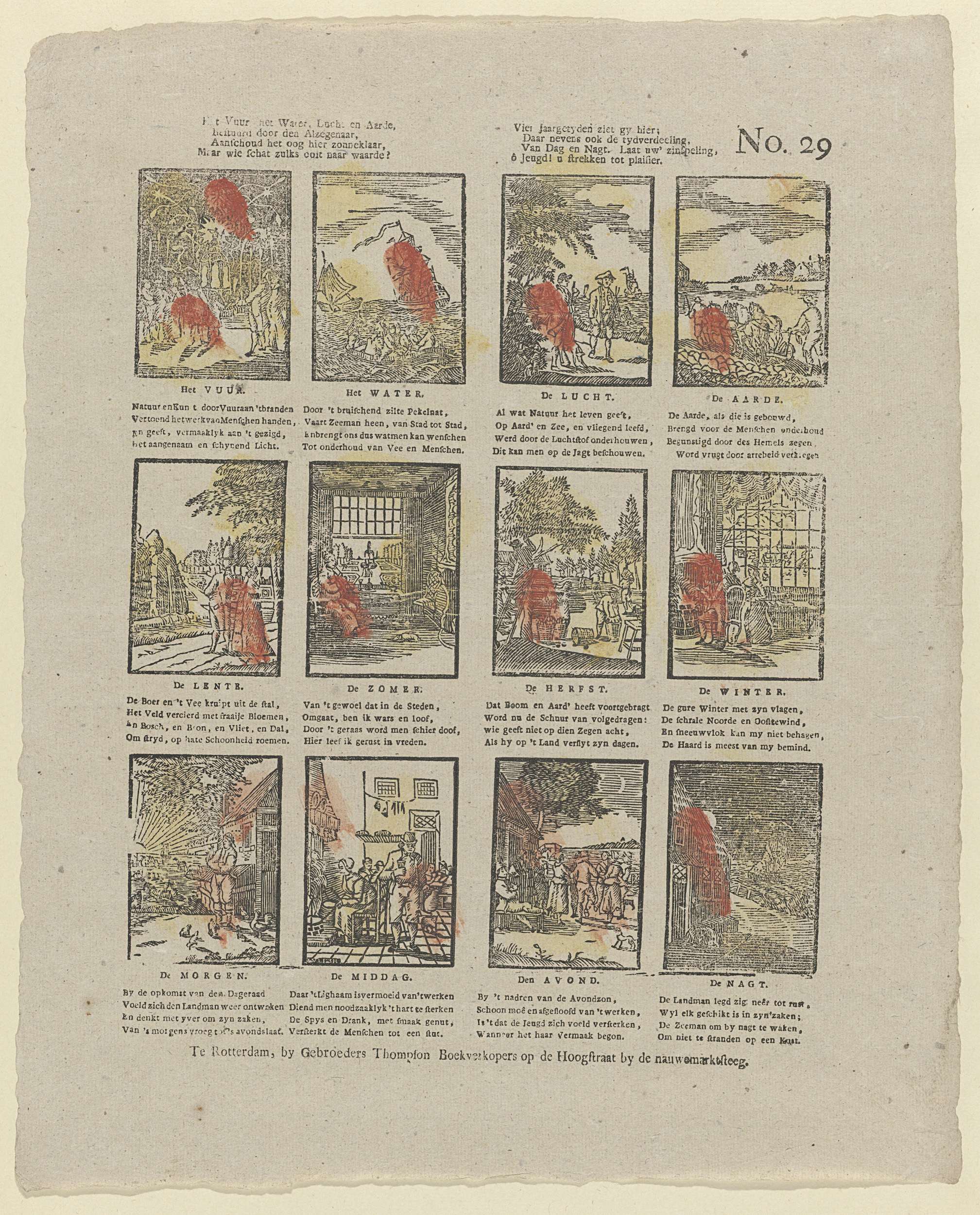 Blad met 12 voorstellingen van de vier elementen, de vier jaargetijden en de vier getijden van de dag. Onder elke afbeelding een titel en een vierregelig vers. Genummerd rechtsboven: No. 29.
