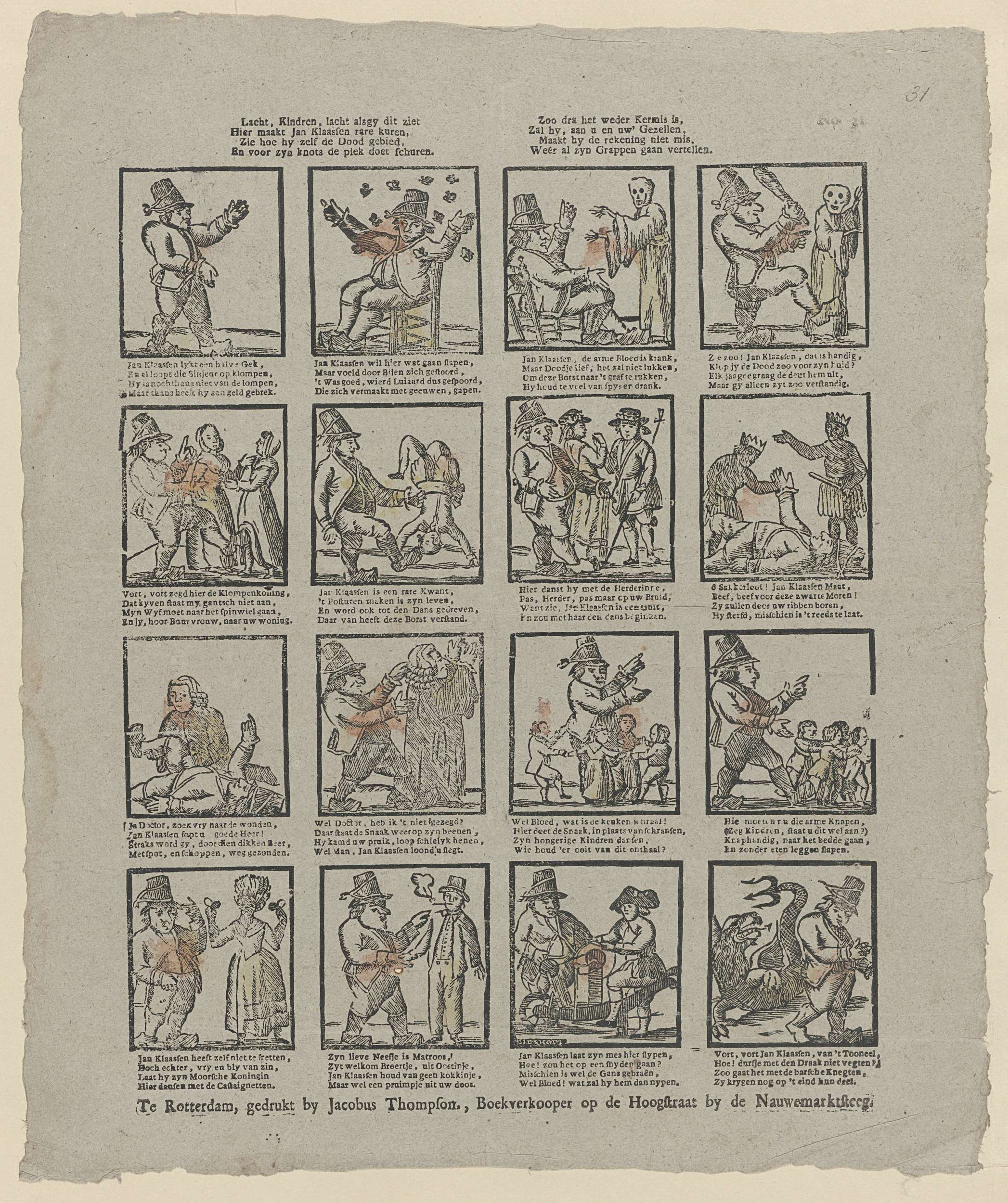 Blad met 16 voorstellingen over het leven van Jan Klaassen. Onder elke afbeelding een vierregelig vers. Genummerd rechtsboven: No. 31.