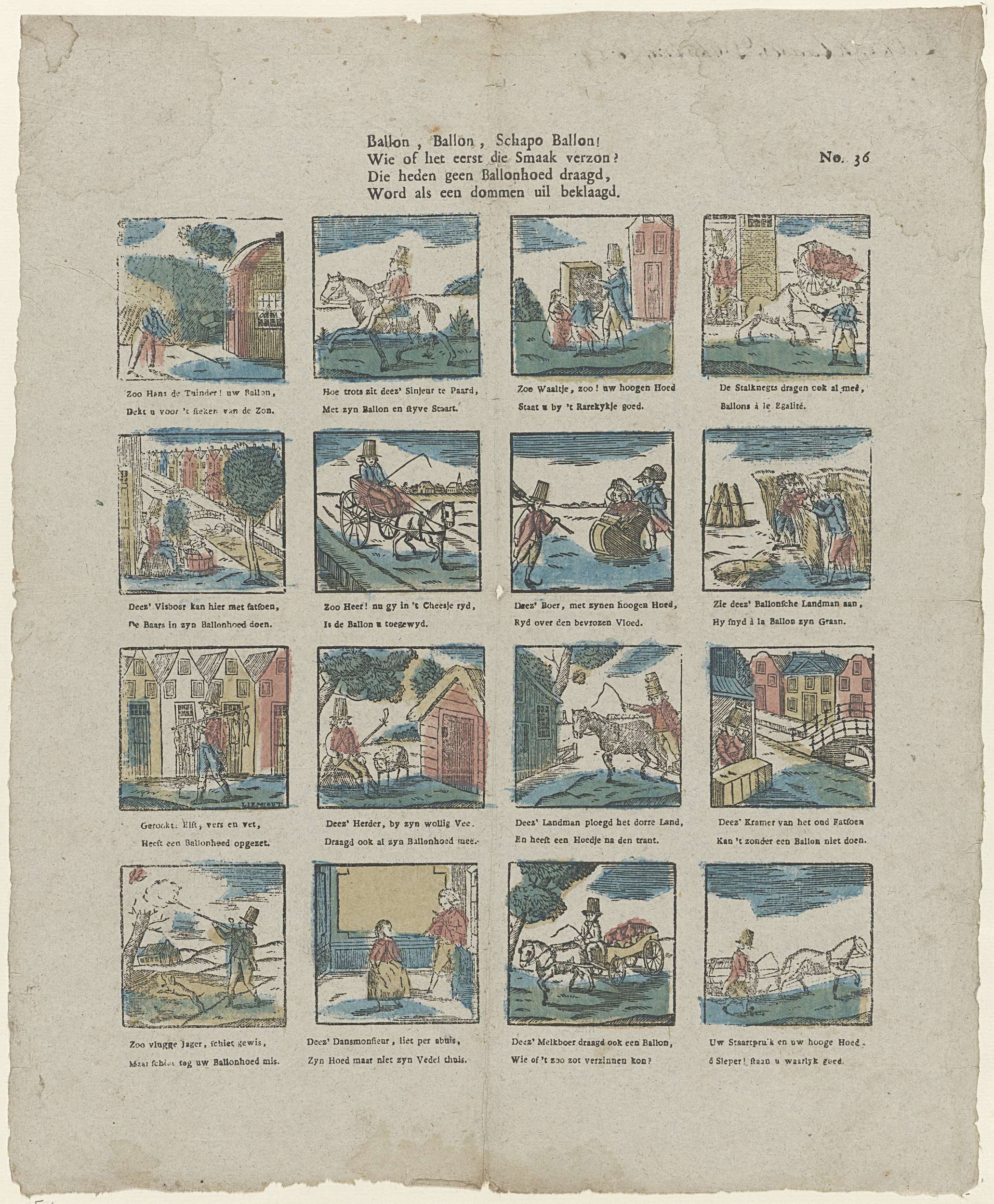 Spotprent op de mode met 16 voorstellingen over het dragen van een hoge hoed bij verschillende beroepen en activiteiten. Onder elke afbeelding een tweeregelig vers. Genummerd rechtsboven: No. 36.