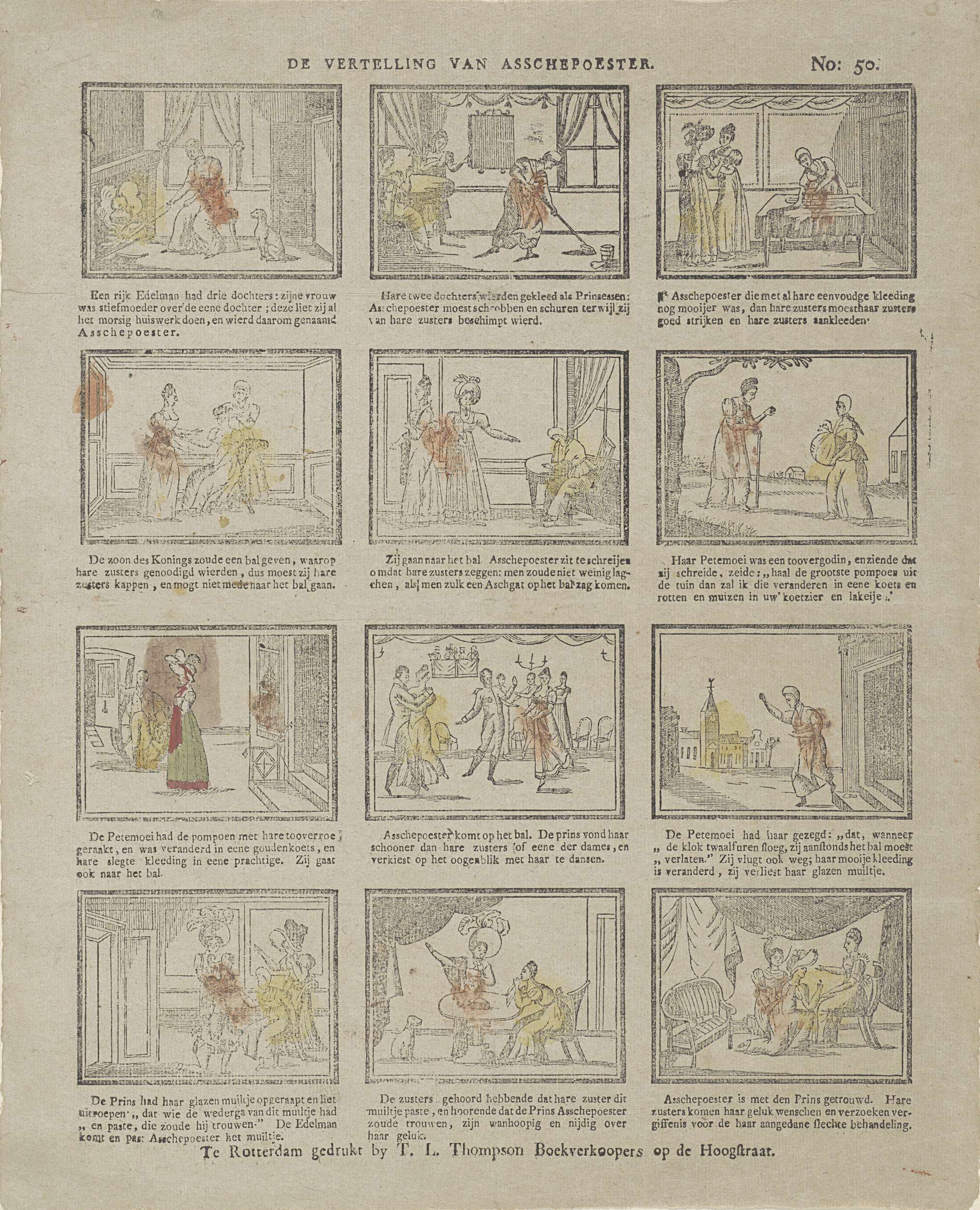 Blad met 12 voorstellingen uit het sprookje van Assepoester. Onder elke afbeelding een drie- of vierregelig onderschrift. Genummerd rechtsboven: No. 50.