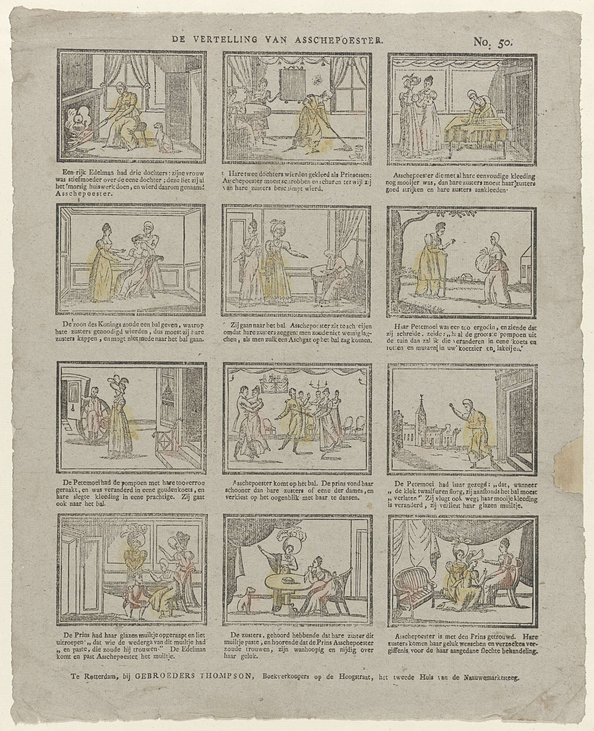 Blad met 12 voorstellingen uit het sprookje van Assepoester. Onder elke afbeelding een drie- of vierregelig onderschrift. Genummerd rechtsboven: No. 50.
