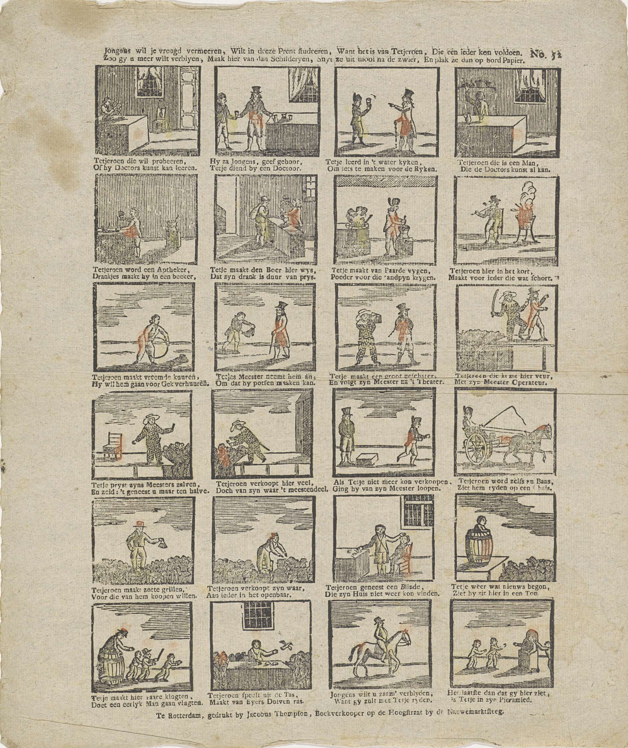 Blad met 24 voorstellingen over de vele vaardigheden en kunsten van Tetjeroen. Onder elke afbeelding een tweeregelig vers. Genummerd rechtsboven: No. 52.