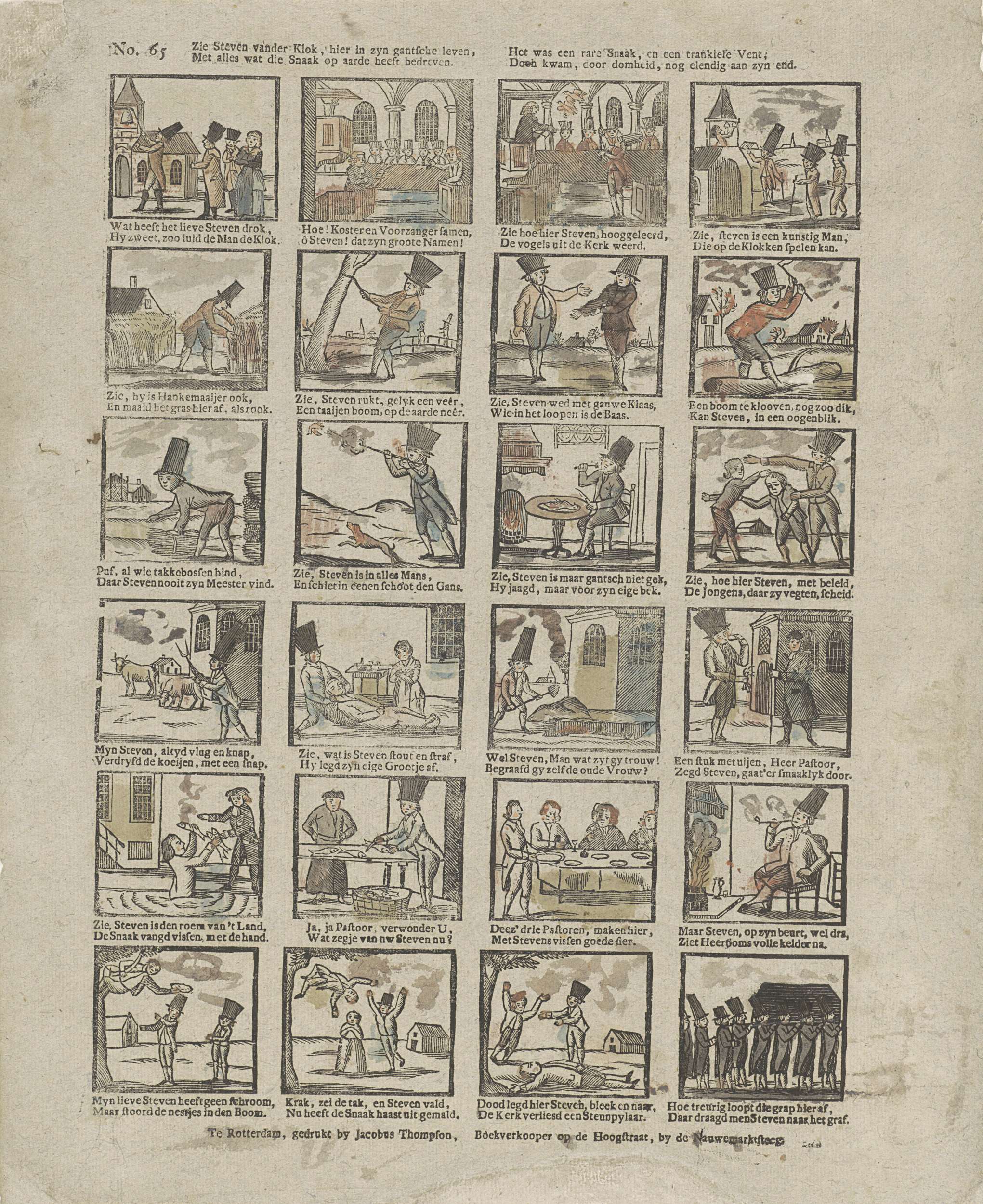 Blad met 24 voorstellingen over het leven van Steven van der Klok. Onder elke afbeelding een tweeregelig vers. Genummerd linksboven: No. 65.