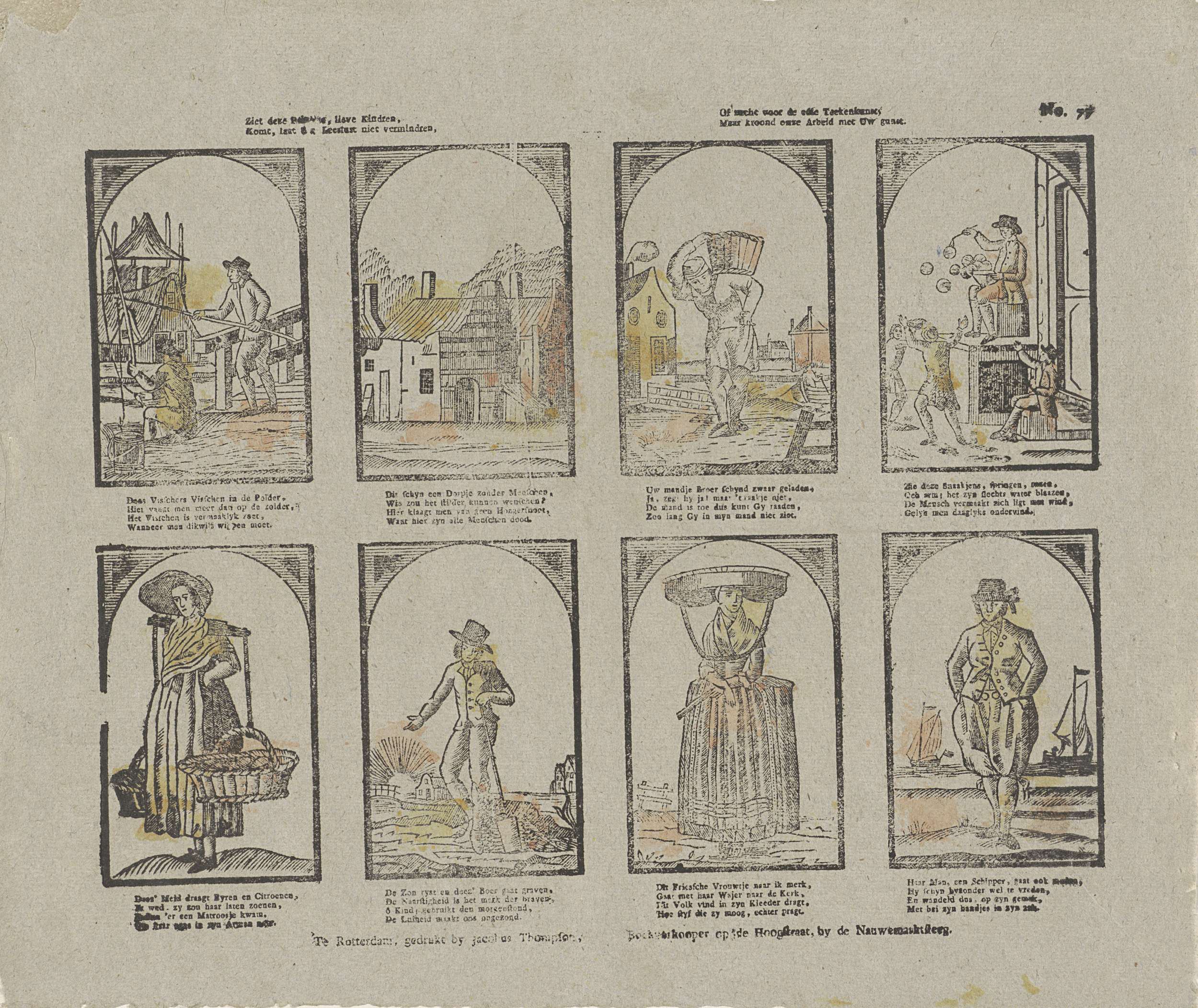 Blad met 8 voorstellingen van verschillende aard, waaronder mannen die vissen bij een brug, een man die zeepbellen maakt en een boer met een spade. Onder elke voorstelling een vierregelig vers. Genummerd rechtsboven: No. 77.