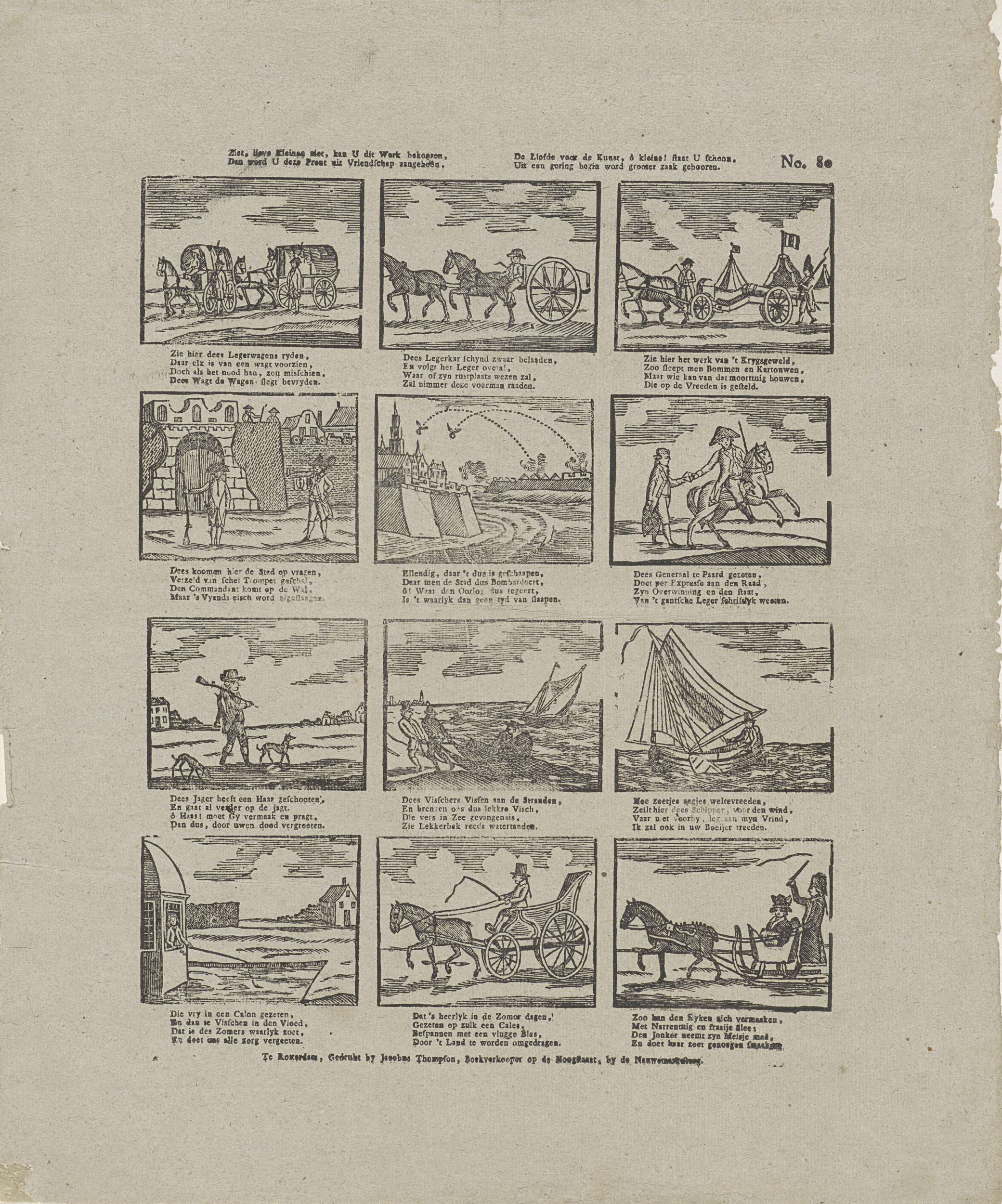 Blad met 12 voorstellingen van militaire en landelijke taferelen. Onder elke afbeelding een vierregelig vers. Genummerd rechtsboven: No. 80.