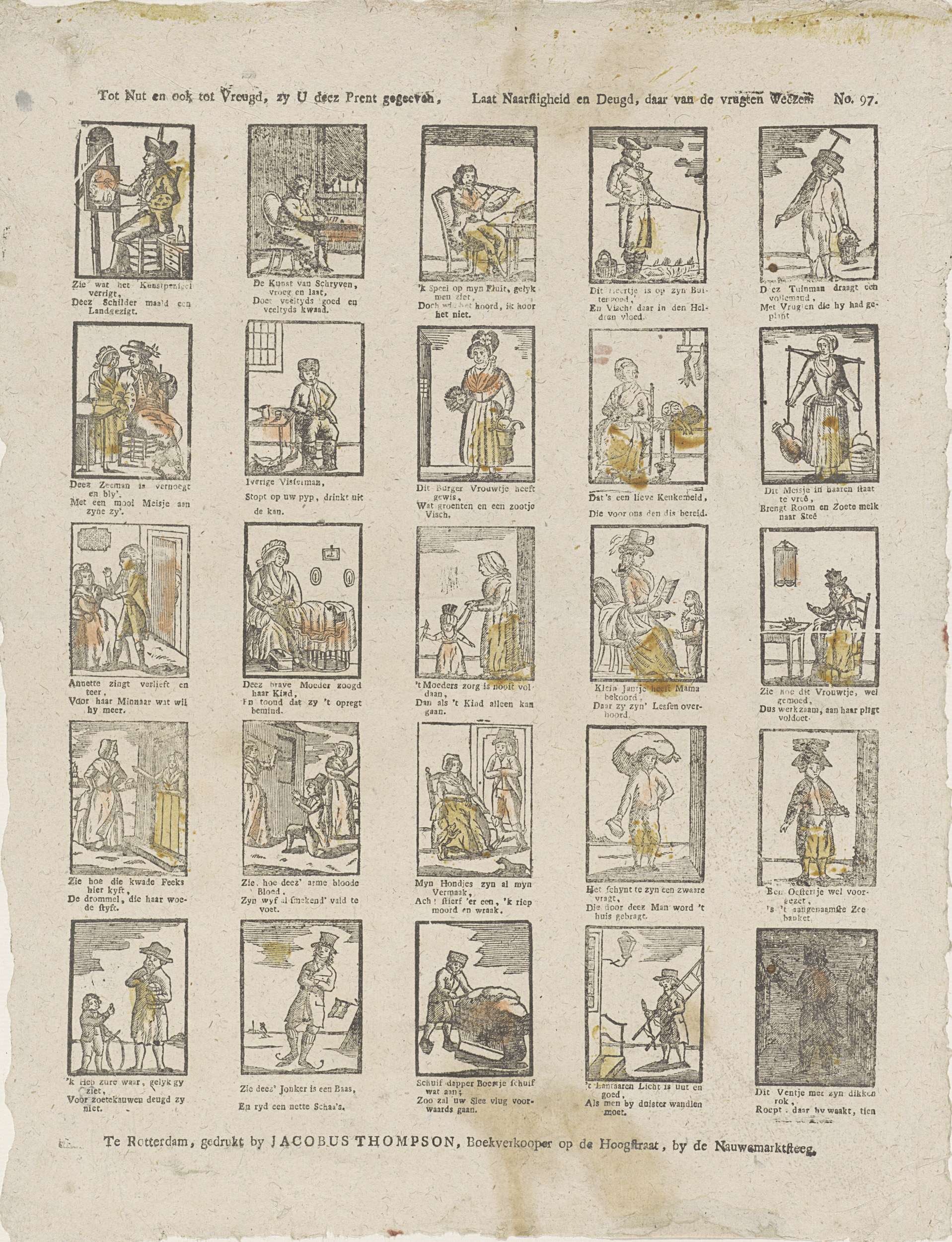 Blad met 25 voorstellingen van ambachten en bezigheden, waaronder schilderen, fluit spelen, groenten en vis verkopen en schaatsen. Onder elke afbeelding een onderschrift. Genummerd rechtsboven: No. 97.