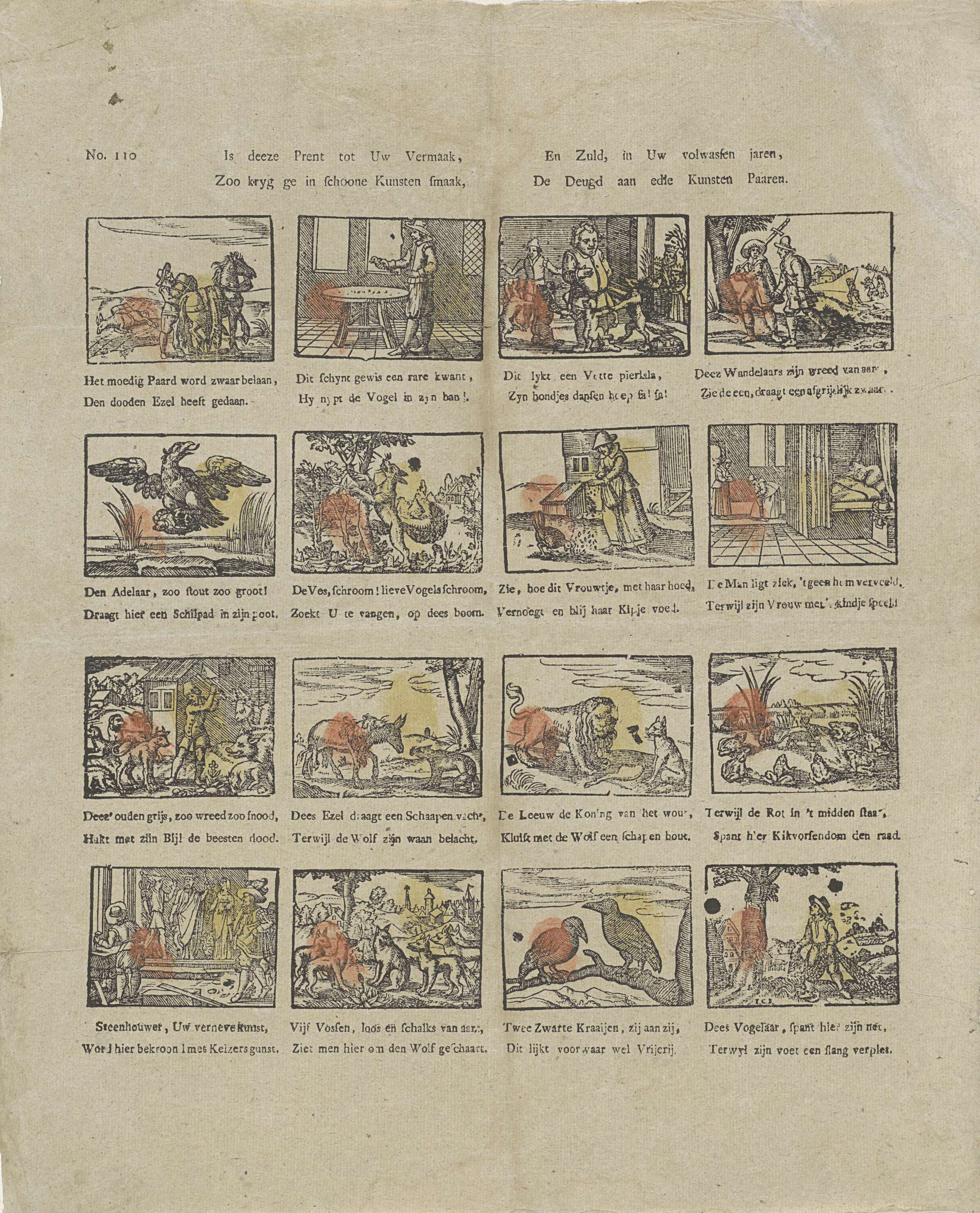Blad met 16 voorstellingen uit de fabelen van Aesopus. Onder elke afbeelding een tweeregelig vers. Genummerd linksboven: No. 110.