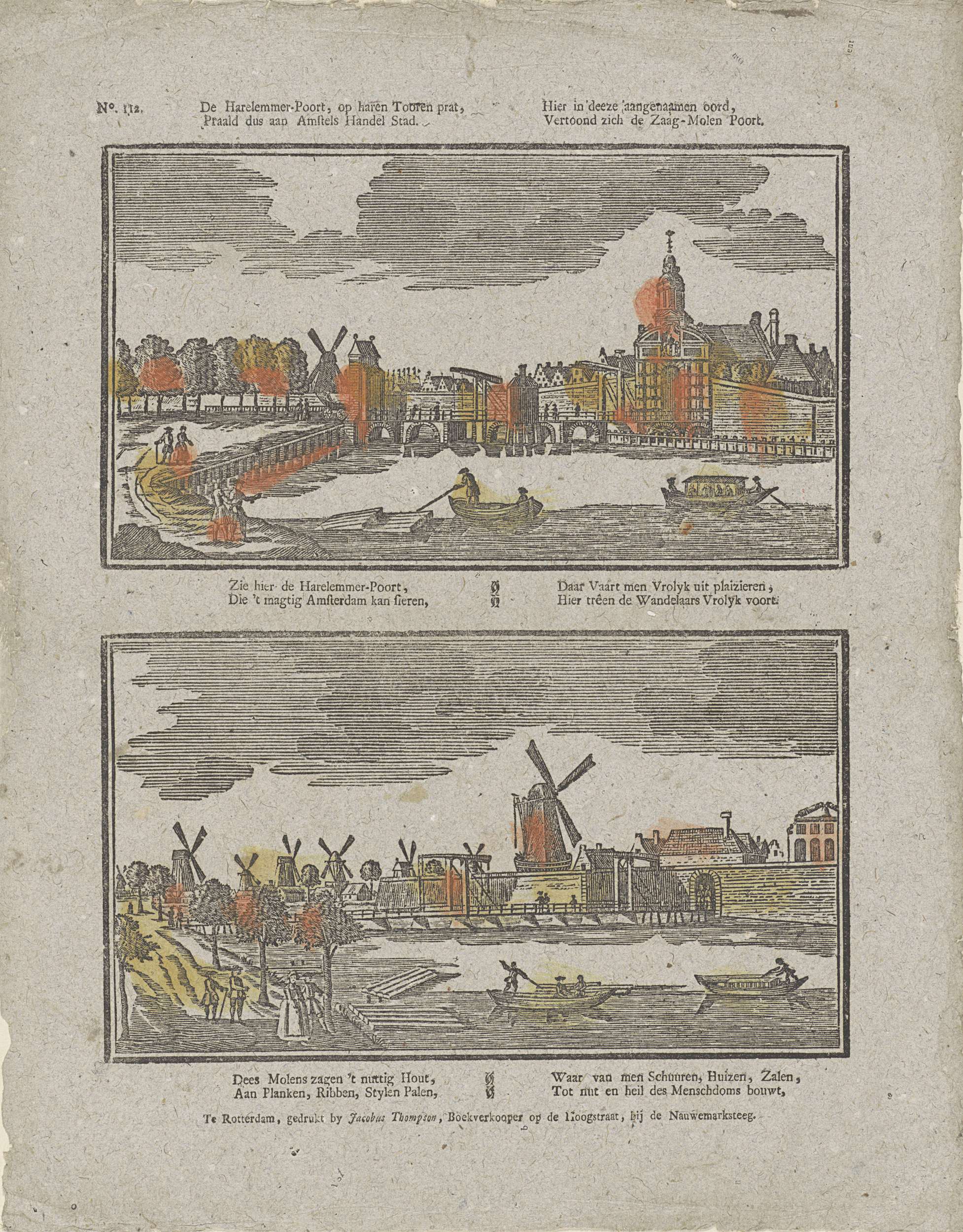 De Harelemmer-Poort, opharen tooren prat, / Praald dus aan Amstels handel stad. / Hier in 'deeze 'aangenaamen oord, / Vertoond aich de zaag-molen poort
