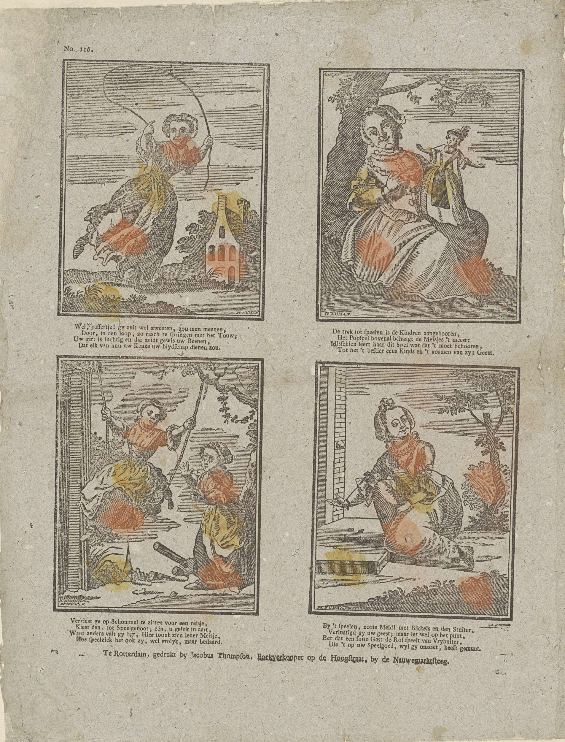 Blad met 4 voorstellingen van spelende meisjes, waaronder een meisje dat touwtje springt, een meisje spelend met een pop, twee meiden die schommelen en een meisje dat met bikkels speelt. Onder elke afbeelding een vierregelig vers. Genummerd linksboven: No. 116.