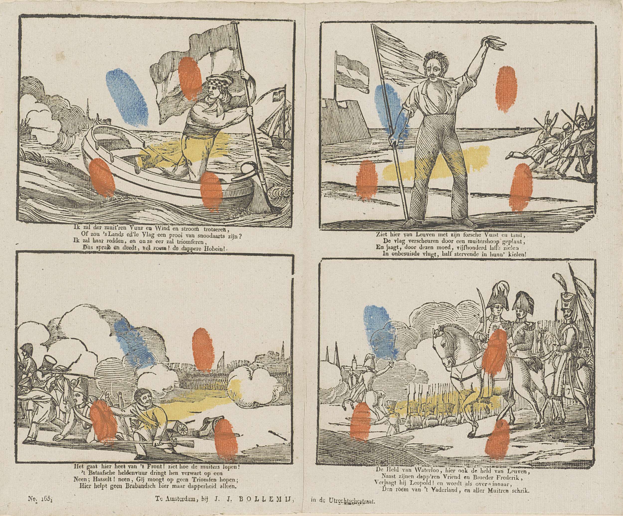 Blad met 4 voorstellingen van gebeurtenissen tijdens de Belgische Revolutie, waaronder Jacob Hobein die de Nederlandse vlag van een sloep wegneemt, en Hendrik van Leuven die zijn tanden in de Nederlandse vlag zet. Onder elke afbeelding een vierregelig vers. Genummerd linksonder: No. 165.