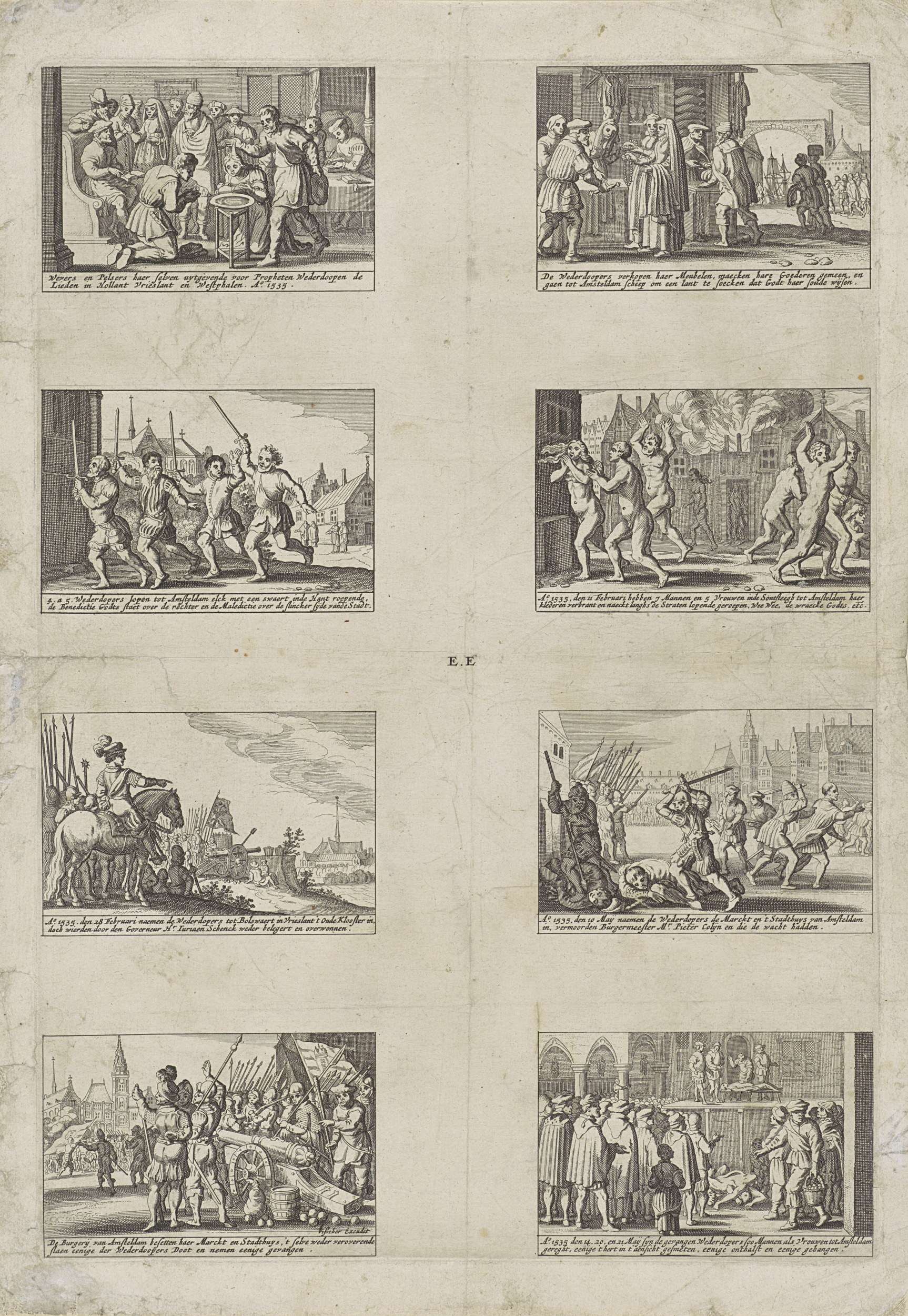 Blad met 8 voorstellingen van de wederdopersoproer in Amsterdam en Friesland. Onder elke afbeelding een onderschrift. Gemerkt midden: E.E.
