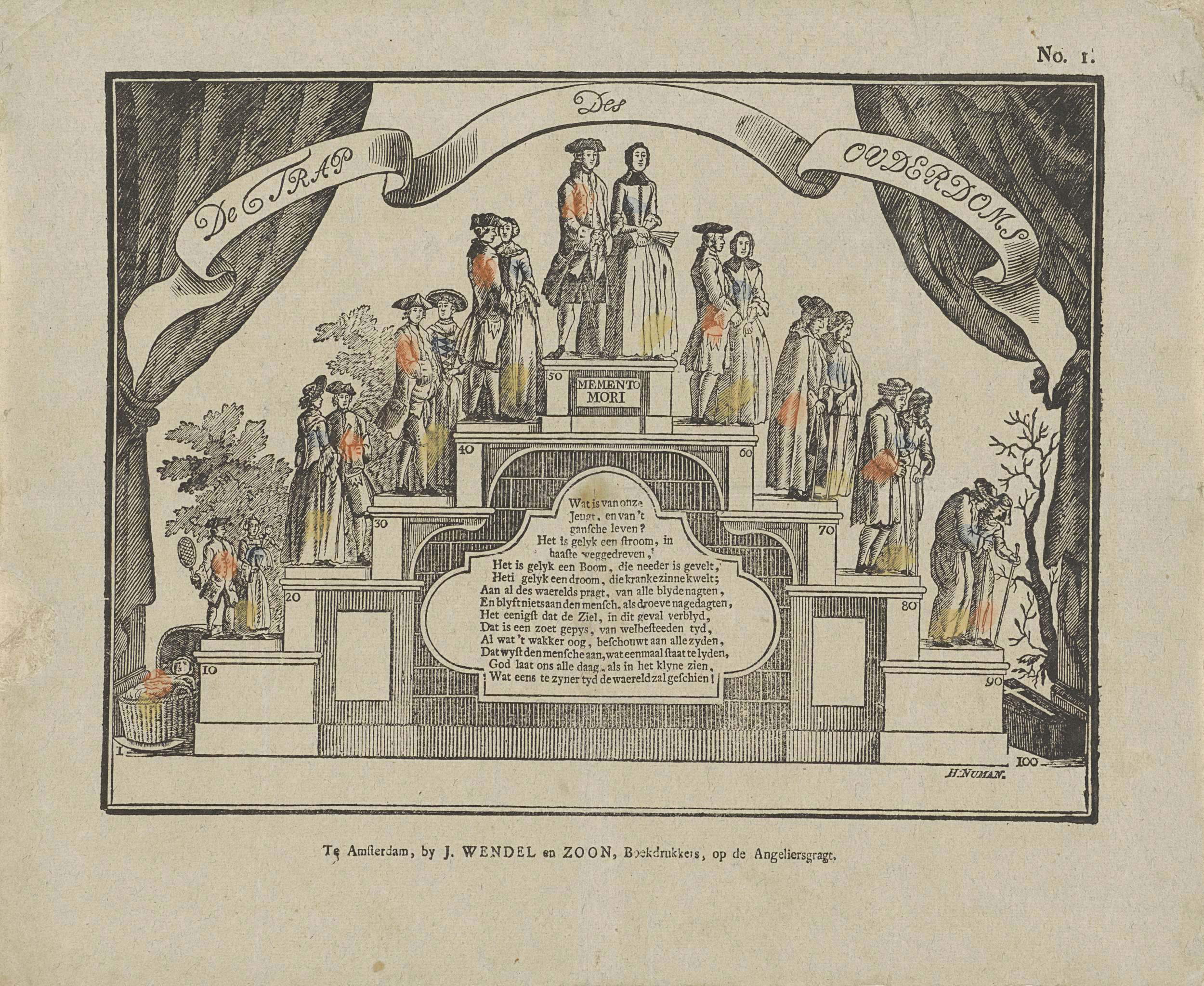 Een trap des ouderdoms: een parentrap. Op de treden van de trap, in de vorm van een brug, staan mannen en vrouwen in de leeftijd van 0 tot 100 jaar. Onder de brug een cartouche met vers. Aan weerszijden van de voorstelling een gordijn. Genummerd rechtsboven: No. 1.