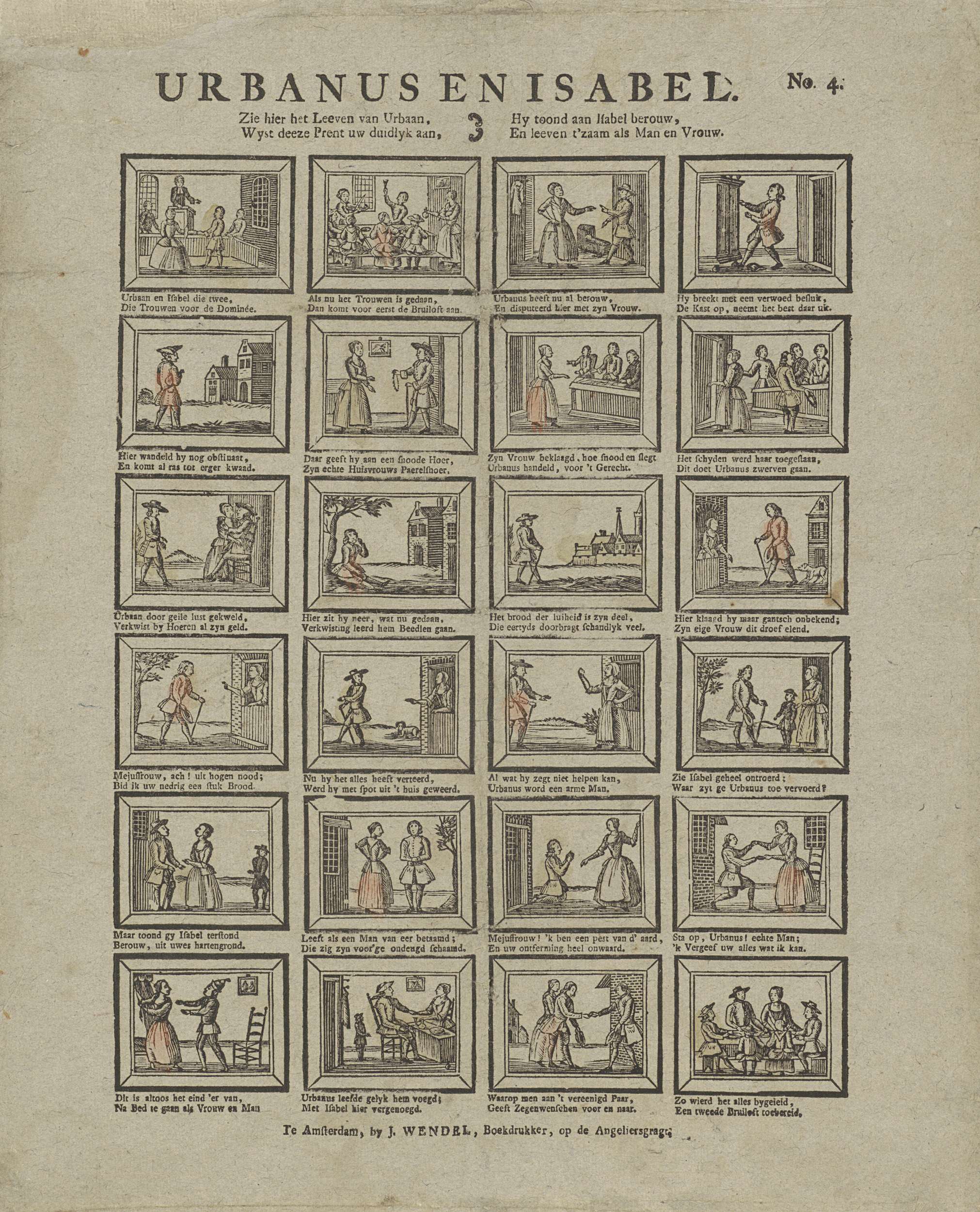 Blad met 24 voorstellingen uit het leven van Urbanus en Isabel. Ze trouwen, maken ruzie, gaan scheiden, en Urbanus wordt een bedelaar. Onder elke voorstelling een tweeregelig vers. Genummerd rechtsboven: No. 4.