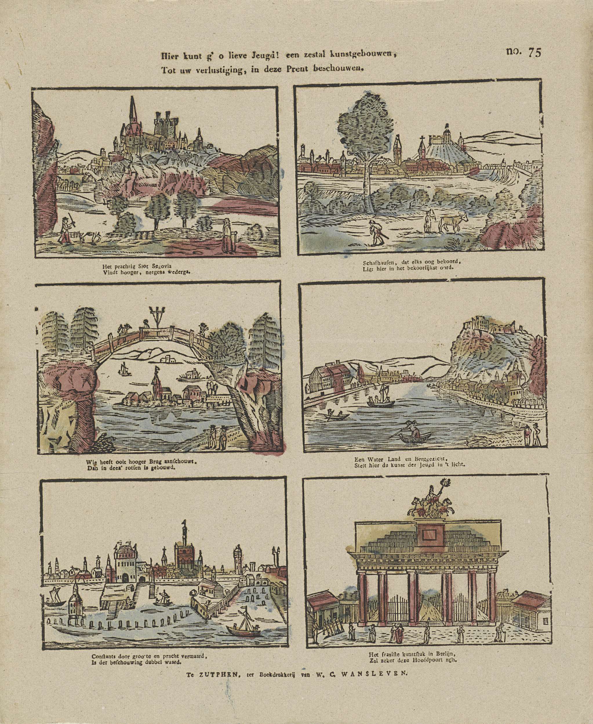 Blad met 6 voorstellingen van stadsgezichten en monumenten, waaronder het kasteel van Segovia en de Brandenburger Tor. Onder elke afbeelding een tweeregelig vers. Genummerd linksboven: no. 75.
