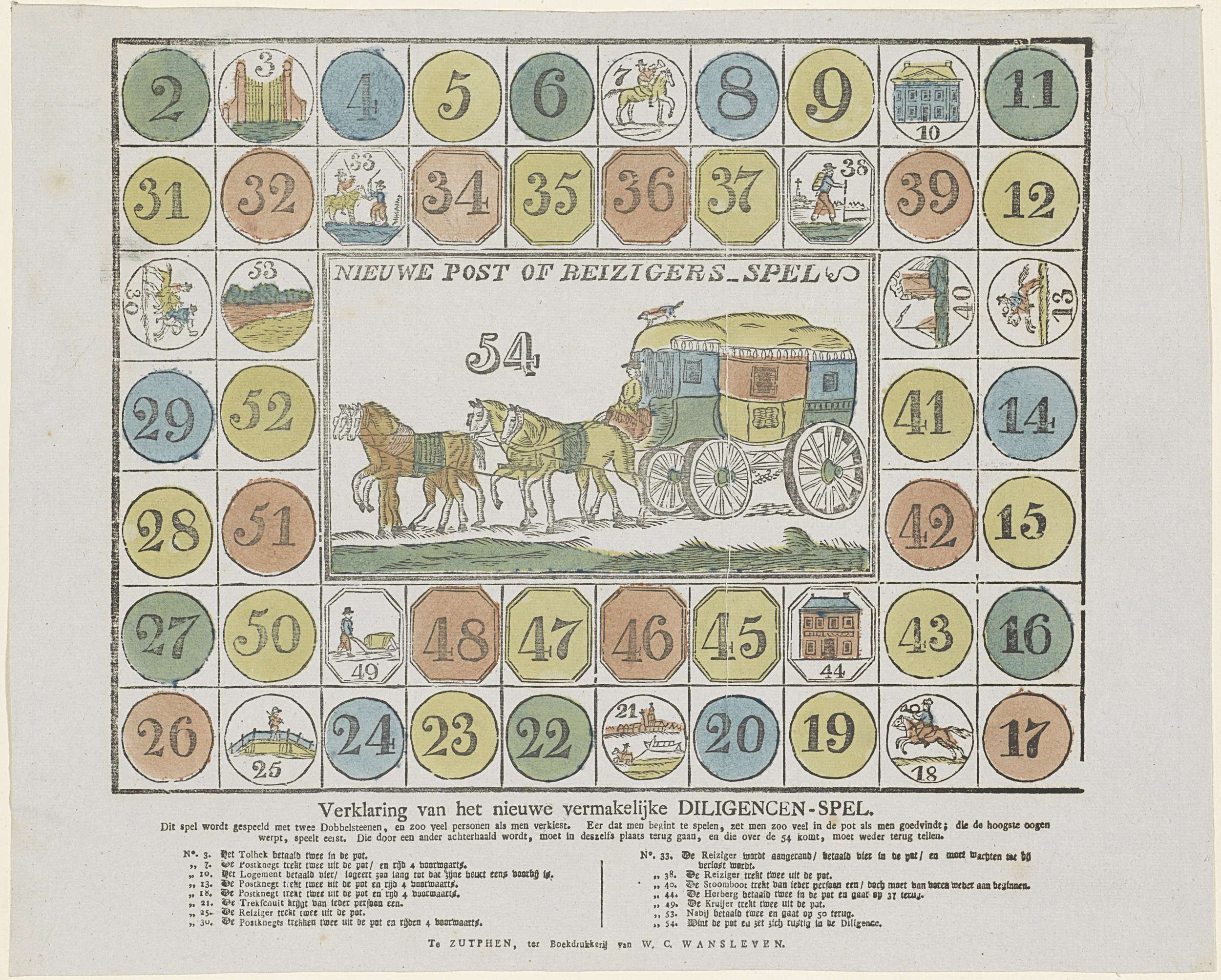Rechthoekig borspel met vakjes genummerd van 2 tot 54. Vakje 54 is groter en toont een rijtuig voortgetrokken door vier paarden. Onder de voorstelling de spelregels.