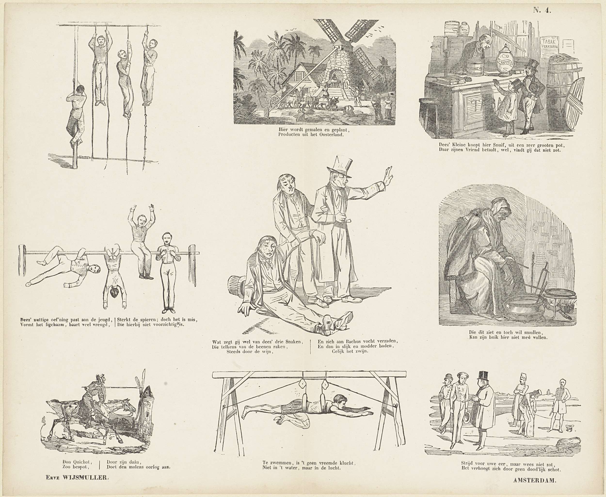 Blad met 9 voorstellingen van verschillende aard, waaronder gymnastiekoefeningen, een molen, een tabakswinkel en dronken lieden. Onder elke afbeelding een onderschrift. Onder de eerste afbeelding het onderschrift: Hier wordt gemalen en geplant, / producten uit het Oosterland. Genummerd rechtsboven: No. 4.