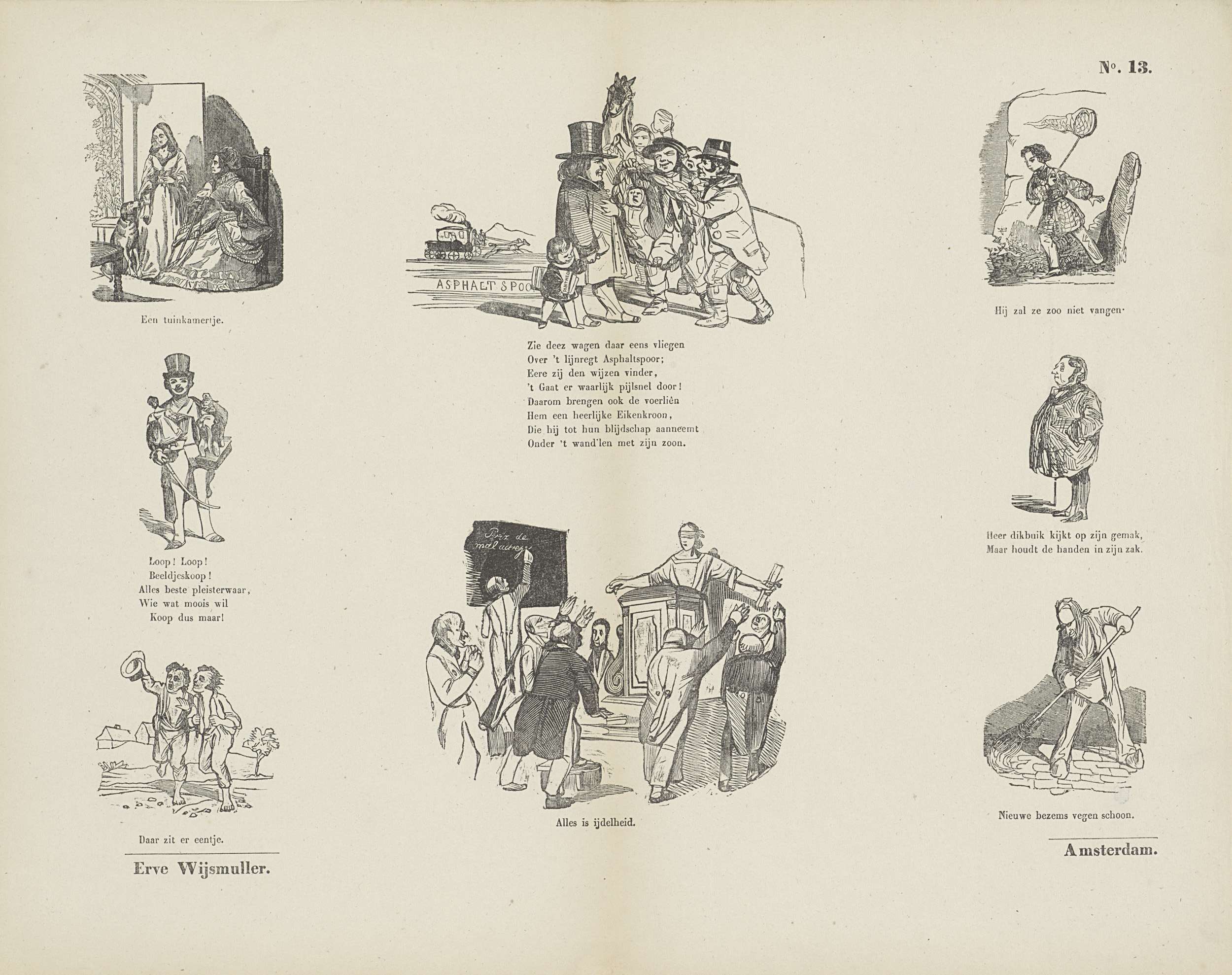 Blad met 8 voorstellingen van verschillende aard, waaronder een vlindervanger en een beeldenkoopman. Onder elke afbeelding een onderschrift. Onder de eerste afbeelding het onderschrift: Een tuinkamertje. Genummerd rechtsboven: No. 13.