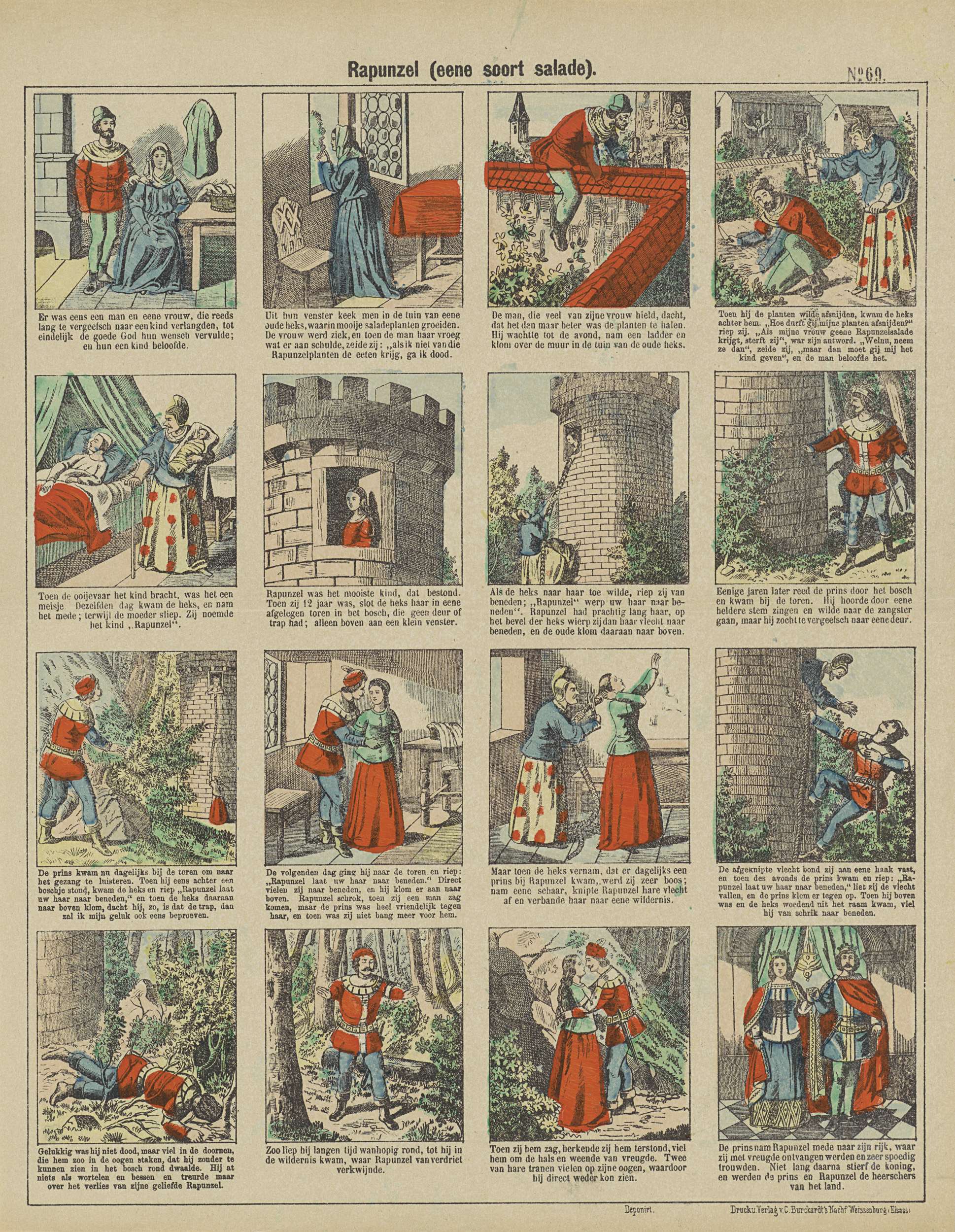 Blad met 16 voorstellingen uit het sprookje van Rapunzel. Onder elke afbeelding een onderschrift. Genummerd rechtsboven: No. 69.