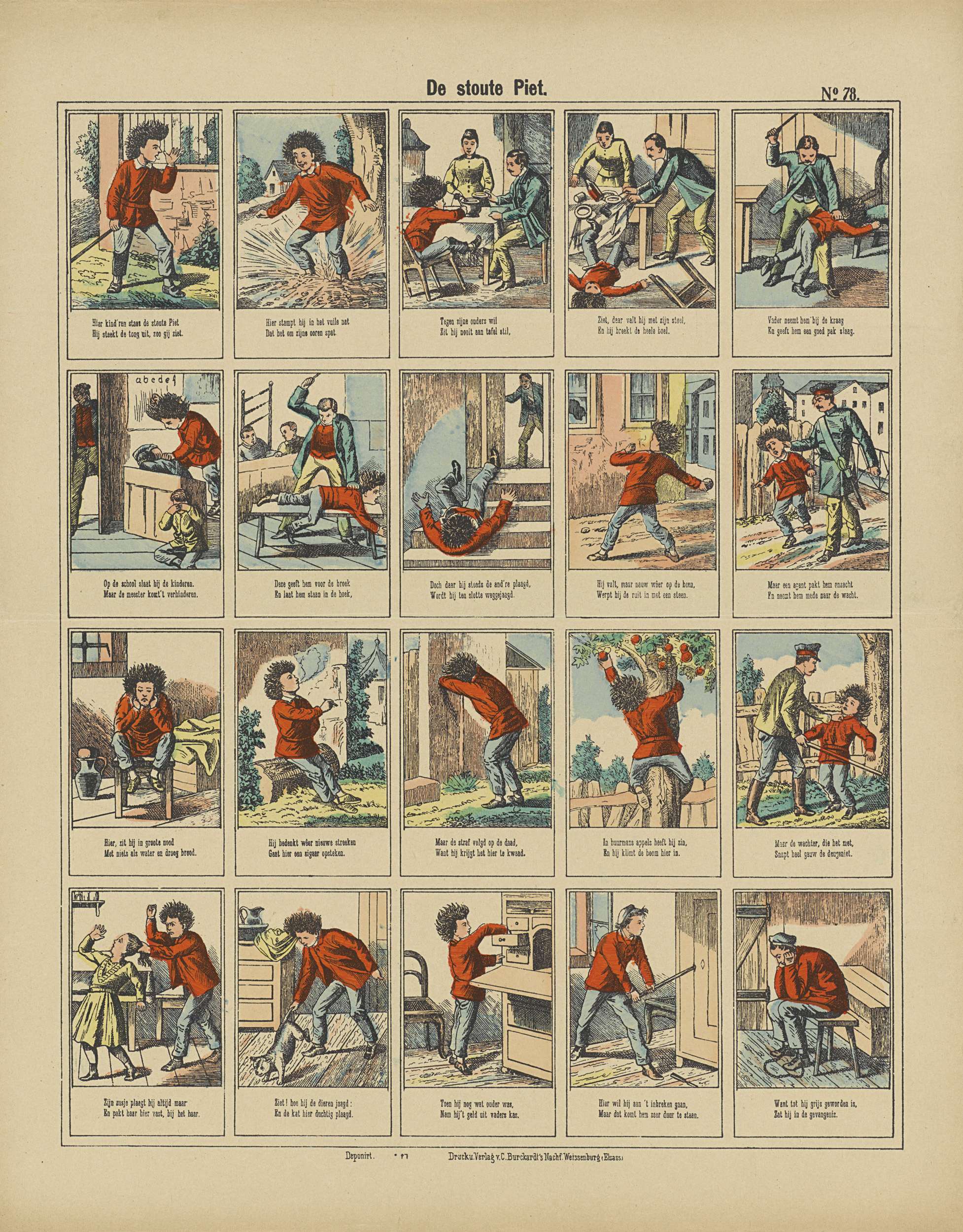 Blad met 20 voorstellingen uit het verhaal van stoute Piet. Onder elke afbeelding een onderschrift. Genummerd rechtsboven: No. 78.