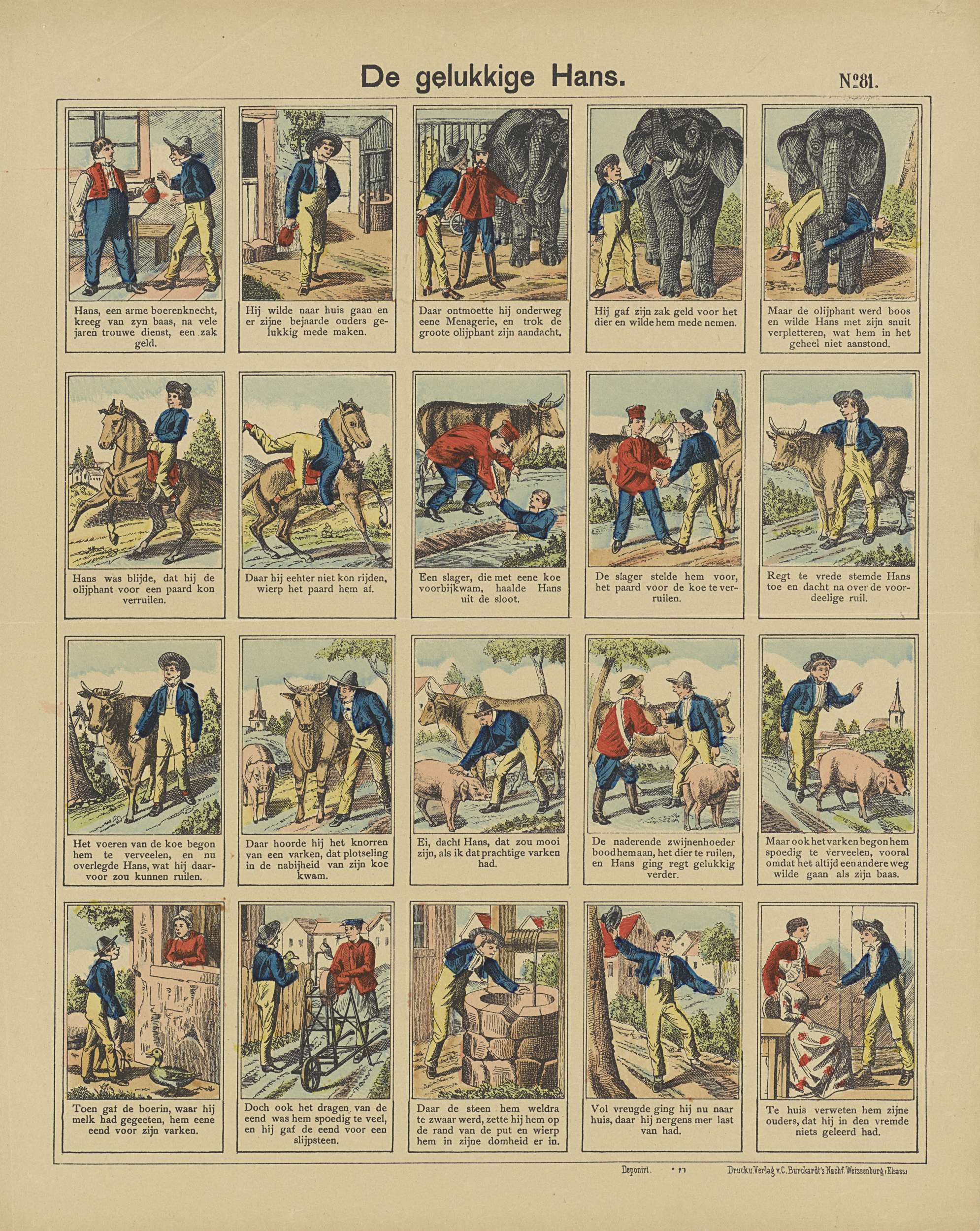 Blad met 20 voorstellingen uit het verhaal van de gelukkige Hans. Onder elke afbeelding een onderschrift. Genummerd rechtsboven: No. 81.