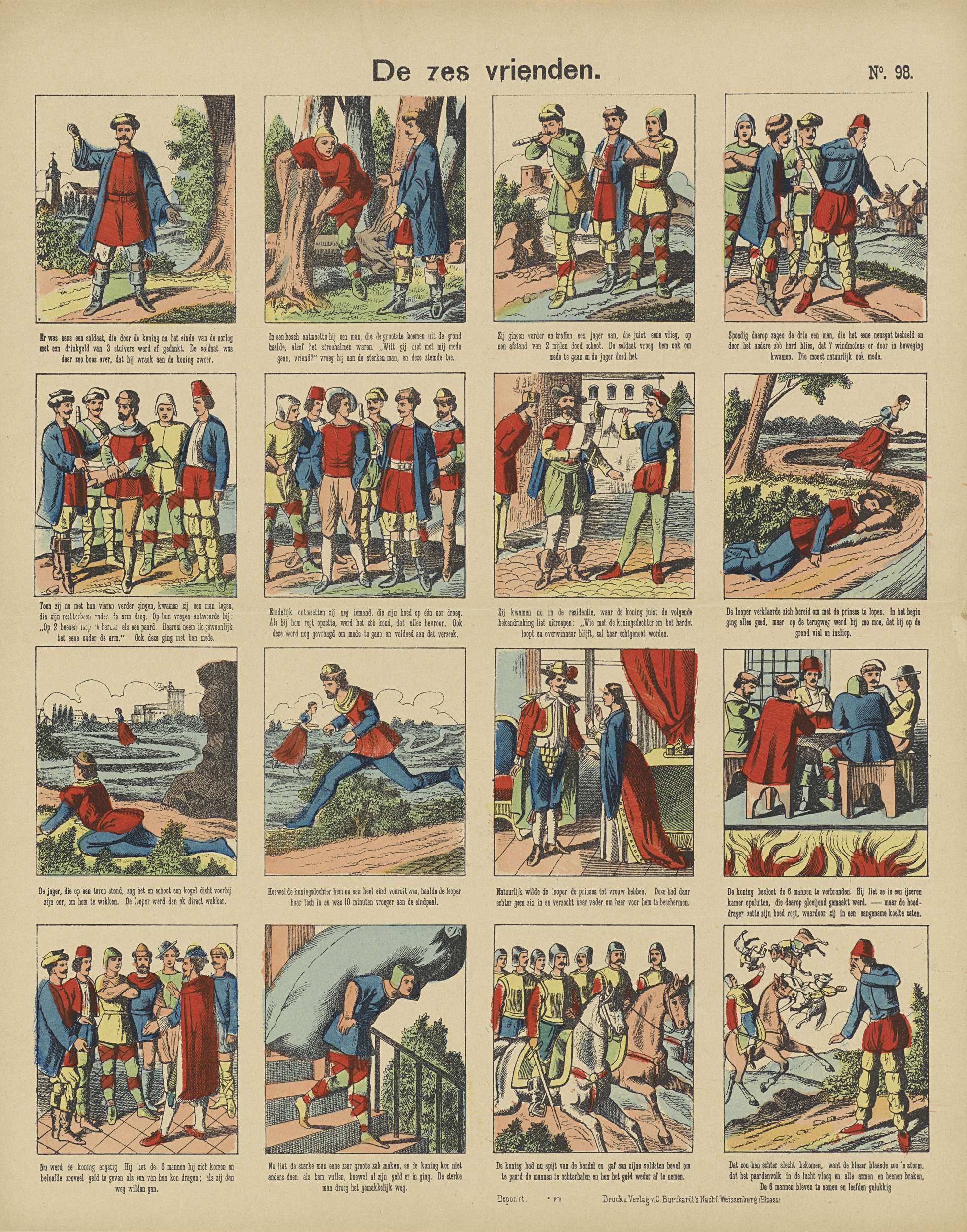Blad met 16 voorstellingen uit het verhaal van de zes vrienden. Onder elke afbeelding een onderschrift. Genummerd rechtsboven: No. 98.