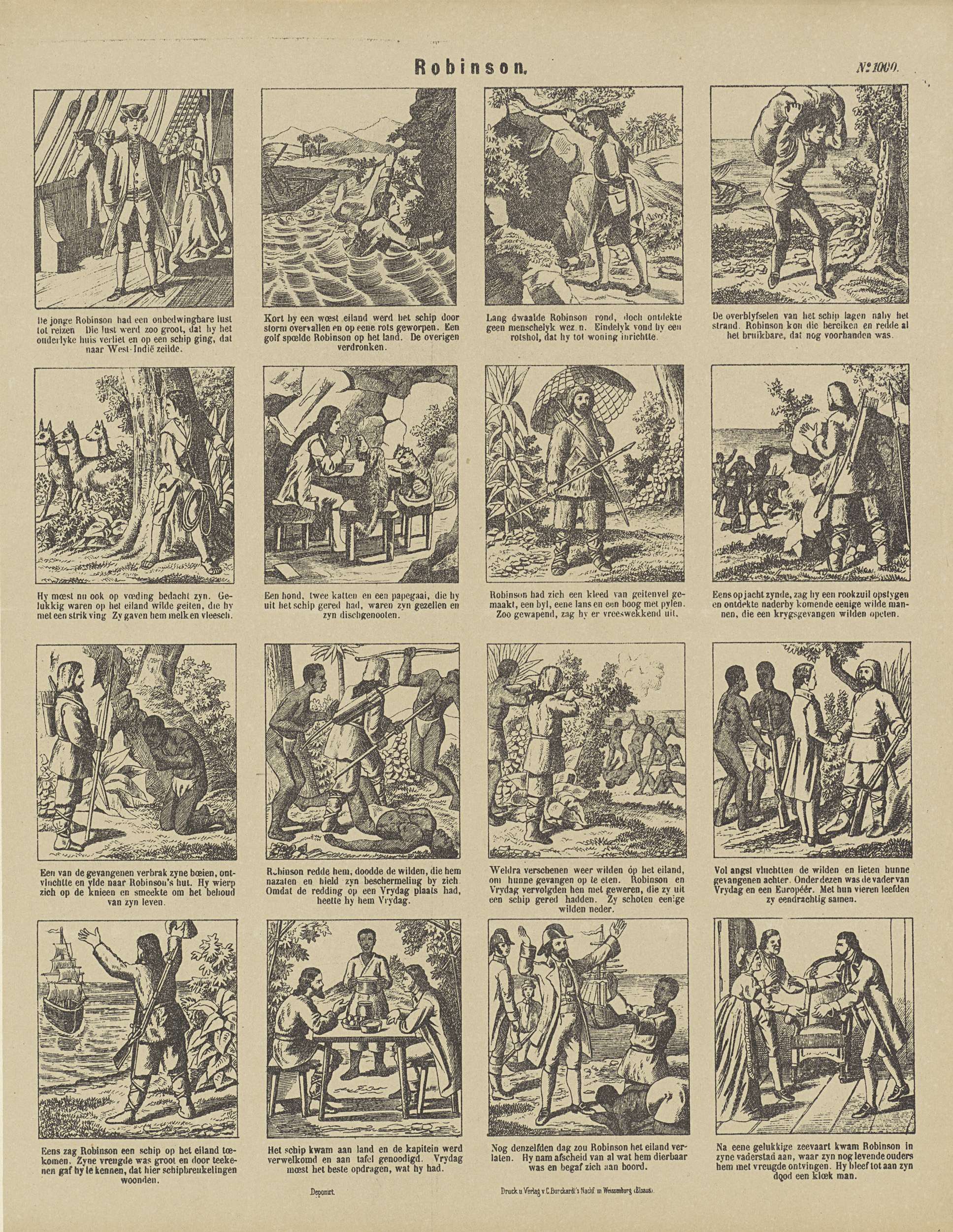 Blad met 16 voorstellingen uit het verhaal van Robinson Crusoe die strandt op een eiland. Onder elke afbeelding een onderschrift. Genummerd rechtsboven: No. 1000.