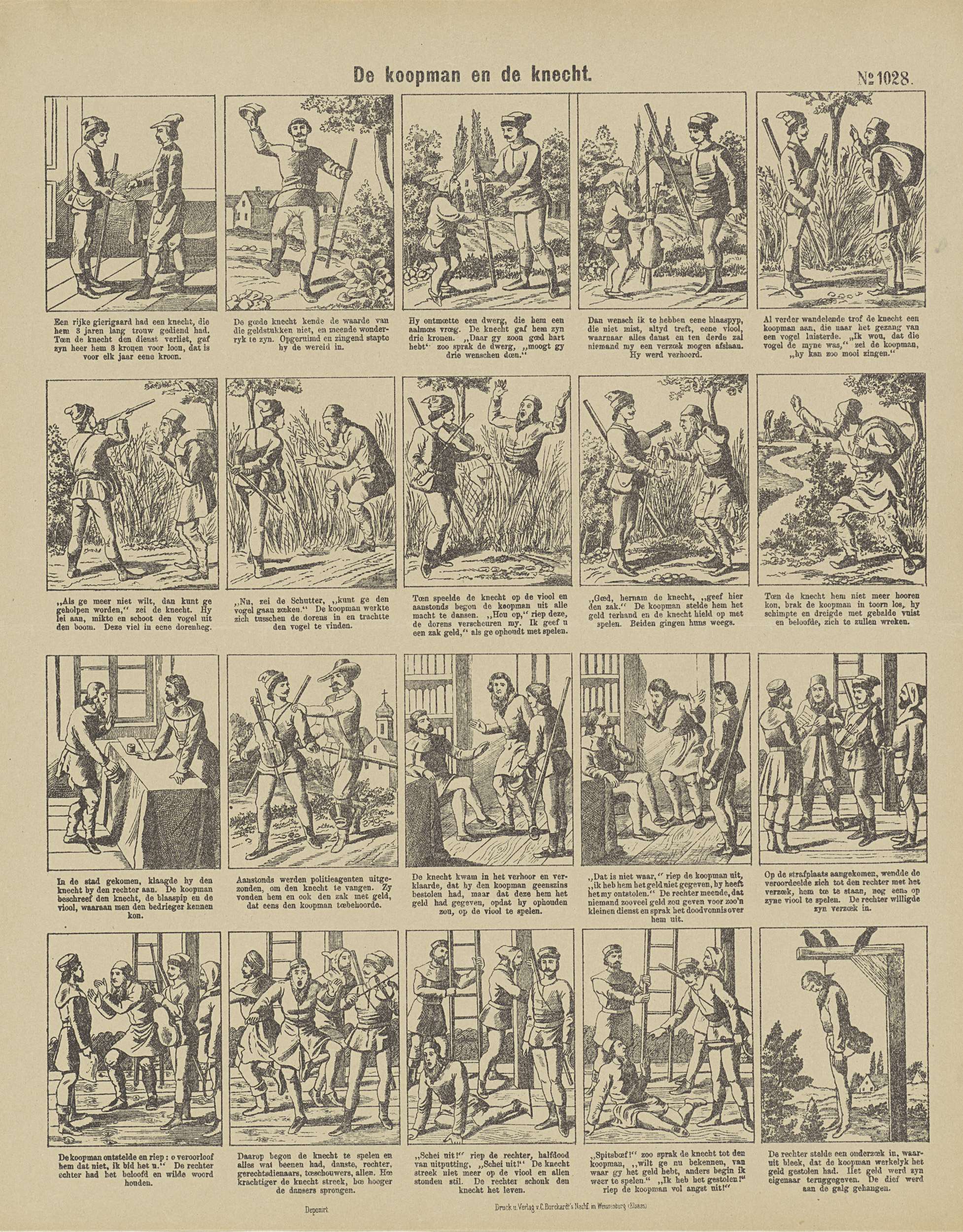 Blad met 16 voorstellingen uit het verhaal van de koopman en de knecht. Onder elke afbeelding een onderschrift. Genummerd rechtsboven: No. 1028.